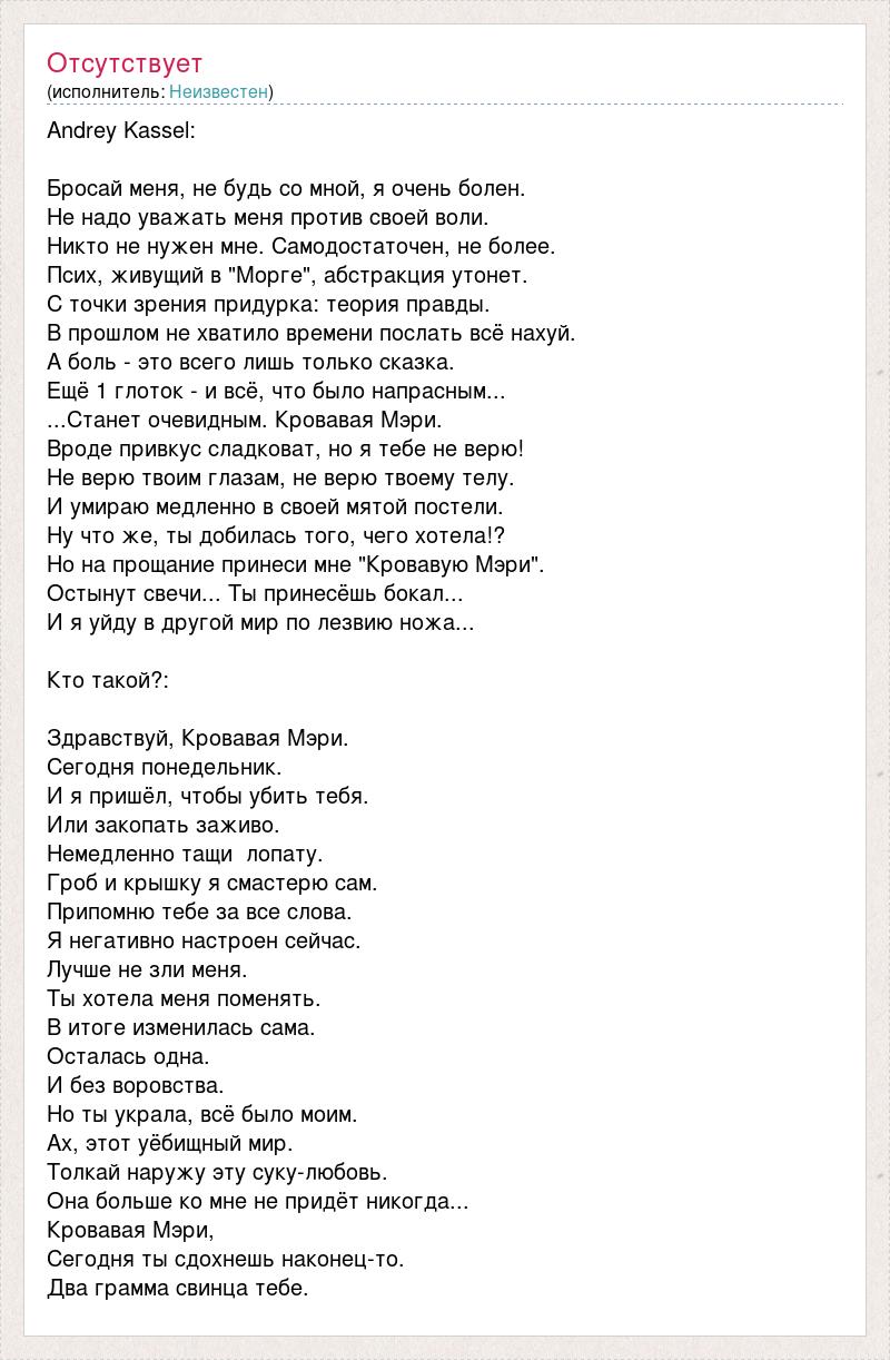 Andrey Kassel: Бросай меня, не будь со мной, я очень болен. Не надо уважать меня против своей воли. Никто не нужен мне. Самодостаточен, не более. Псих, живущий в "Морге", абстракция утонет. С точки зрения придурка: теория правды. В прошлом не хватило времени послать всё нахуй. А боль - это всего лишь только сказка. Ещё 1 глоток - и всё, что было напрасным... ...Станет очевидным. Кровавая Мэри. Вроде привкус сладковат, но я тебе не верю! Не верю твоим глазам, не верю твоему телу. И умираю медленно в своей мятой постели. Ну что же, ты добилась того, чего хотела!? Но на прощание принеси мне "Кровавую Мэри". Остынут свечи... Ты принесёшь бокал... И я уйду в другой мир по лезвию ножа... Кто такой?: Здравствуй, Кровавая Мэри. Сегодня понедельник. И я пришёл, чтобы убить тебя. Или закопать заживо. Немедленно тащи лопату. Гроб и крышку я смастерю сам. Припомню тебе за все слова. Я негативно настроен сейчас. Лучше не зли меня. Ты хотела меня поменять. В итоге изменилась сама. Осталась одна. И без воровства. Но ты украла, всё было моим. Ах, этот уёбищный мир. Толкай наружу эту суку-любовь. Она больше ко мне не придёт никогда... Кровавая Мэри, Сегодня ты сдохнешь наконец-то. Два грамма свинца тебе.