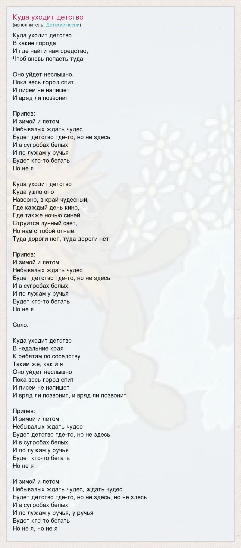 Куда уходит детство В какие города И где найти нам средство, Чтоб вновь попасть туда Оно уйдет неслышно, Пока весь город спит И писем не напишет И вряд ли позвонит Припев: И зимой и летом Небывалых ждать чудес Будет детство где-то, но не здесь И в сугробах белых И по лужам у ручья Будет кто-то бегать Но не я Куда уходит детство Куда ушло оно Наверно, в край чудесный, Где каждый день кино, Где также ночью синей Струится лунный свет, Но нам с тобой отные, Туда дороги нет, туда дороги нет Припев: И зимой и летом Небывалых ждать чудес Будет детство где-то, но не здесь И в сугробах белых И по лужам у ручья Будет кто-то бегать Но не я Соло. Куда уходит детство В недальние края К ребятам по соседству Таким же, как и я Оно уйдет неслышно Пока весь город спит И писем не напишет И вряд ли позвонит, и вряд ли позвонит Припев: И зимой и летом Небывалых ждать чудес Будет детство где-то, но не здесь И в сугробах белых И по лужам у ручья Будет кто-то бегать Но не я И зимой и летом Небывалых ждать чудес, ждать чудес Будет детство где-то, но не здесь, но не здесь И в сугробах белых И по лужам у ручья, у ручья Будет кто-то бегать Но не я, но не я