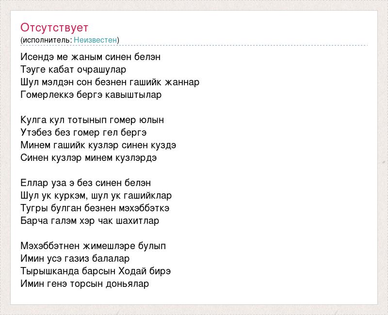 Исендэ ме жаным синен белэн Тэуге кабат очрашулар Шул мэлдэн сон безнен гашийк жаннар Гомерлеккэ бергэ кавыштылар Кулга кул тотынып гомер юлын Утэбез без гомер гел бергэ Минем гашийк кузлэр синен куздэ Синен кузлэр минем кузлэрдэ Еллар уза э без синен белэн Шул ук куркэм, шул ук гашийклар Тугры булган безнен мэхэббэткэ Барча галэм хэр чак шахитлар Мэхэббэтнен жимешлэре булып Имин усэ газиз балалар Тырышканда барсын Ходай бирэ Имин генэ торсын доньялар