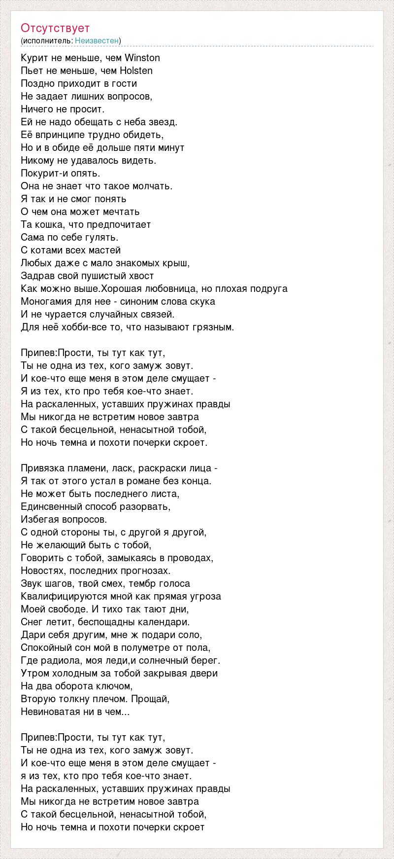 Курит не меньше, чем Winston Пьет не меньше, чем Holsten Поздно приходит в гости Не задает лишних вопросов, Ничего не просит. Ей не надо обещать с неба звезд. Её впринципе трудно обидеть, Но и в обиде её дольше пяти минут Никому не удавалось видеть. Покурит-и опять. Она не знает что такое молчать. Я так и не смог понять О чем она может мечтать Та кошка, что предпочитает Сама по себе гулять. С котами всех мастей Любых даже с мало знакомых крыш, Задрав свой пушистый хвост Как можно выше.Хорошая любовница, но плохая подруга Моногамия для нее - синоним слова скука И не чурается случайных связей. Для неё хобби-все то, что называют грязным. Припев:Прости, ты тут как тут, Ты не одна из тех, кого замуж зовут. И кое-что еще меня в этом деле смущает - Я из тех, кто про тебя кое-что знает. На раскаленных, уставших пружинах правды Мы никогда не встретим новое завтра С такой бесцельной, ненасытной тобой, Но ночь темна и похоти почерки скроет. Привязка пламени, ласк, раскраски лица - Я так от этого устал в романе без конца. Не может быть последнего листа, Единсвенный способ разорвать, Избегая вопросов. С одной стороны ты, с другой я другой, Не желающий быть с тобой, Говорить с тобой, замыкаясь в проводах, Новостях, последних прогнозах. Звук шагов, твой смех, тембр голоса Квалифицируются мной как прямая угроза Моей свободе. И тихо так тают дни, Снег летит, беспощадны календари. Дари себя другим, мне ж подари соло, Спокойный сон мой в полуметре от пола, Где радиола, моя леди,и солнечный берег. Утром холодным за тобой закрывая двери На два оборота ключом, Вторую толкну плечом. Прощай, Невиноватая ни в чем... Припев:Прости, ты тут как тут, Ты не одна из тех, кого замуж зовут. И кое-что еще меня в этом деле смущает - я из тех, кто про тебя кое-что знает. На раскаленных, уставших пружинах правды Мы никогда не встретим новое завтра С такой бесцельной, ненасытной тобой, Но ночь темна и похоти почерки скроет