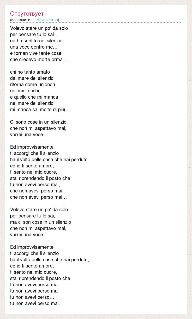 Volevo stare un po' da solo per pensare tu lo sai… ed ho sentito nel silenzio una voce dentro me… e tornan vive tante cose che credevo morte ormai… chi ho tanto amato dal mare del silenzio ritorna come un'onda nei miei occhi, e quello che mi manca nel mare del silenzio mi manca sai molto di piщ… Ci sono cose in un silenzio, che non mi aspettavo mai, vorrei una voce… Ed improvvisamente ti accorgi che il silenzio ha il volto delle cose che hai perduto ed io ti sento amore, ti sento nel mio cuore, stai riprendendo il posto che tu non avevi perso mai, che non avevi perso mai, che non avevi perso mai… Volevo stare un po' da solo per pensare tu lo sai, ma ci son cose in un silenzio che non mi aspettavo mai, vorrei una voce… Ed improvvisamente ti accorgi che il silenzio ha il volto delle cose che hai perduto, ed io ti sento amore, ti sento nel mio cuore, stai riprendendo il posto che tu non avevi perso mai tu non avevi perso mai tu non avevi perso… tu non avevi perso mai.