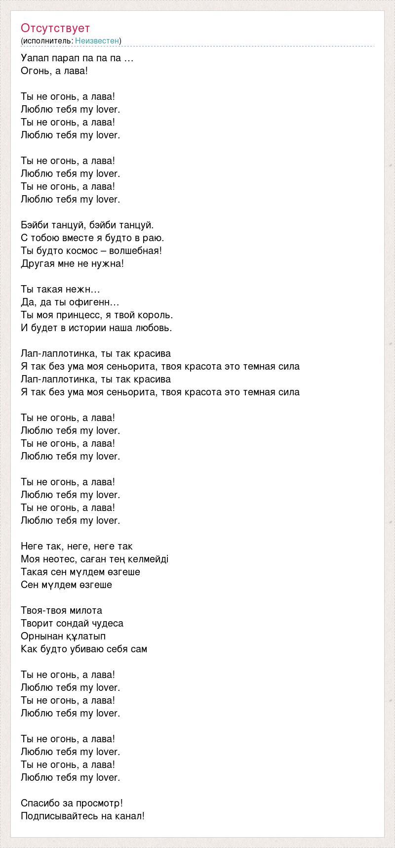 Уапап парап па па па … Огонь, а лава! Ты не огонь, а лава! Люблю тебя my lover. Ты не огонь, а лава! Люблю тебя my lover. Ты не огонь, а лава! Люблю тебя my lover. Ты не огонь, а лава! Люблю тебя my lover. Бэйби танцуй, бэйби танцуй. С тобою вместе я будто в раю. Ты будто космос – волшебная! Другая мне не нужна! Ты такая нежн… Да, да ты офигенн… Ты моя принцесс, я твой король. И будет в истории наша любовь. Лап-лаплотинка, ты так красива Я так без ума моя сеньорита, твоя красота это темная сила Лап-лаплотинка, ты так красива Я так без ума моя сеньорита, твоя красота это темная сила Ты не огонь, а лава! Люблю тебя my lover. Ты не огонь, а лава! Люблю тебя my lover. Ты не огонь, а лава! Люблю тебя my lover. Ты не огонь, а лава! Люблю тебя my lover. Неге так, неге, неге так Моя неотес, саған тең келмейді Такая сен мүлдем өзгеше Сен мүлдем өзгеше Твоя-твоя милота Творит сондай чудеса Орнынан құлатып Как будто убиваю себя сам Ты не огонь, а лава! Люблю тебя my lover. Ты не огонь, а лава! Люблю тебя my lover. Ты не огонь, а лава! Люблю тебя my lover. Ты не огонь, а лава! Люблю тебя my lover. Спасибо за просмотр! Подписывайтесь на канал!