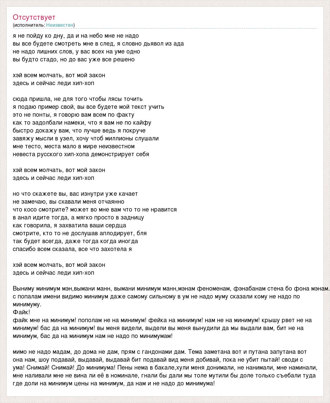 я не пойду ко дну, да и на небо мне не надо вы все будете смотреть мне в след, я словно дьявол из ада не надо лишних слов, у вас всех на уме одно вы будто стадо, но до вас уже все решено хэй всем молчать, вот мой закон здесь и сейчас леди хип-хоп сюда пришла, не для того чтобы лясы точить я подаю пример свой, вы все будете мой текст учить это не понты, я говорю вам всем по факту как то задолбали намеки, что я вам не по кайфу быстро докажу вам, что лучше ведь я покруче завяжу мысли в узел, хочу чтоб миллионы слушали мне тесто, места мало в мире неизвестном невеста русского хип-хопа демонстрирует себя хэй всем молчать, вот мой закон здесь и сейчас леди хип-хоп но что скажете вы, вас изнутри уже качает не замечаю, вы схавали меня отчаянно что косо смотрите? может во мне вам что то не нравится в анал идите тогда, а мягко просто в задницу как говорила, я захватила ваши сердца смотрите, кто то не дослушав аплодирует, бля так будет всегда, даже тогда когда иногда спасибо всем сказала, все что захотела я хэй всем молчать, вот мой закон здесь и сейчас леди хип-хоп Выниму минимум мэн,вымани манн, вымани минимум манн,мэнам феноменам, фэнабанам стена бо фона мэнам. с попалам имени видимо минимум даже самому сильному в ум не надо муму сказали кому не надо по минимуму. Файк! файк мне на минимум! пополам не на минимум! фейка на минимум! нам не на минимум! крышу рвет не на минимум! бас да на минимум! вы меня видели, выдели вы меня вынудили да мы выдали вам, бит не на минимум, бас да на минимум нам не надо по минимумам! мимо не надо мадам, до дома не дам, прям с гандонами дам. Тема заметана вот и путана запутана вот она нам, шоу подавай, выдавай, выдавай бит подавай вид меня добивай, пока не убит пытай! своди с ума! Снимай! Снимай! До минимума! Пены нема в бакале,хули меня донимали, не нанимали, мне наминали, мне наливали мне не вина ли её в номинале, гнали бы дали мы толе мутили бы доле только съебали туда где доли на минимум цены на минимум, да нам и не надо до минимума!