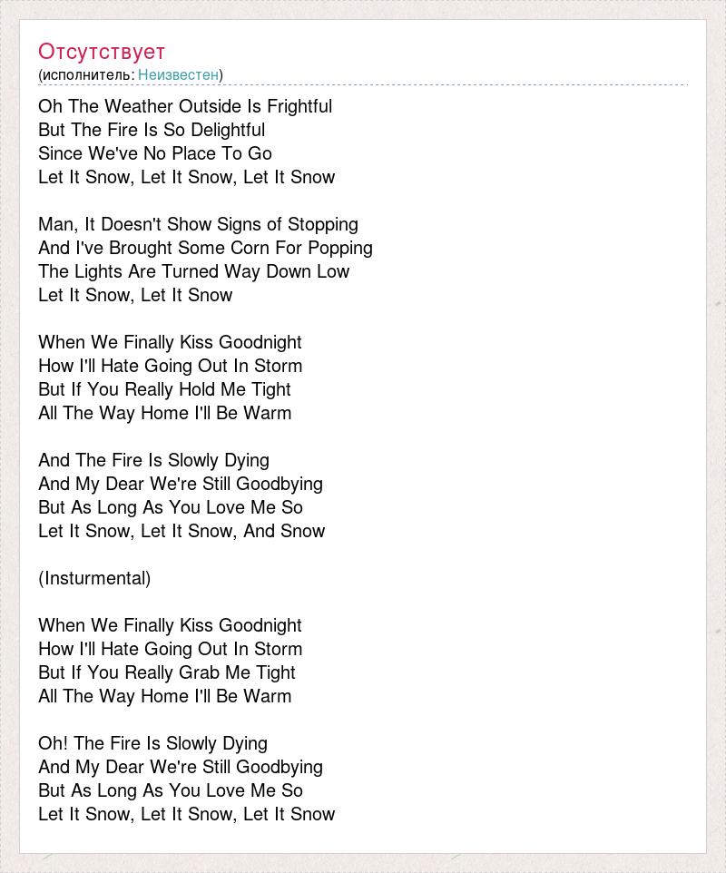 Oh The Weather Outside Is Frightful But The Fire Is So Delightful Since We've No Place To Go Let It Snow, Let It Snow, Let It Snow Man, It Doesn't Show Signs of Stopping And I've Brought Some Corn For Popping The Lights Are Turned Way Down Low Let It Snow, Let It Snow When We Finally Kiss Goodnight How I'll Hate Going Out In Storm But If You Really Hold Me Tight All The Way Home I'll Be Warm And The Fire Is Slowly Dying And My Dear We're Still Goodbying But As Long As You Love Me So Let It Snow, Let It Snow, And Snow (Insturmental) When We Finally Kiss Goodnight How I'll Hate Going Out In Storm But If You Really Grab Me Tight All The Way Home I'll Be Warm Oh! The Fire Is Slowly Dying And My Dear We're Still Goodbying But As Long As You Love Me So Let It Snow, Let It Snow, Let It Snow