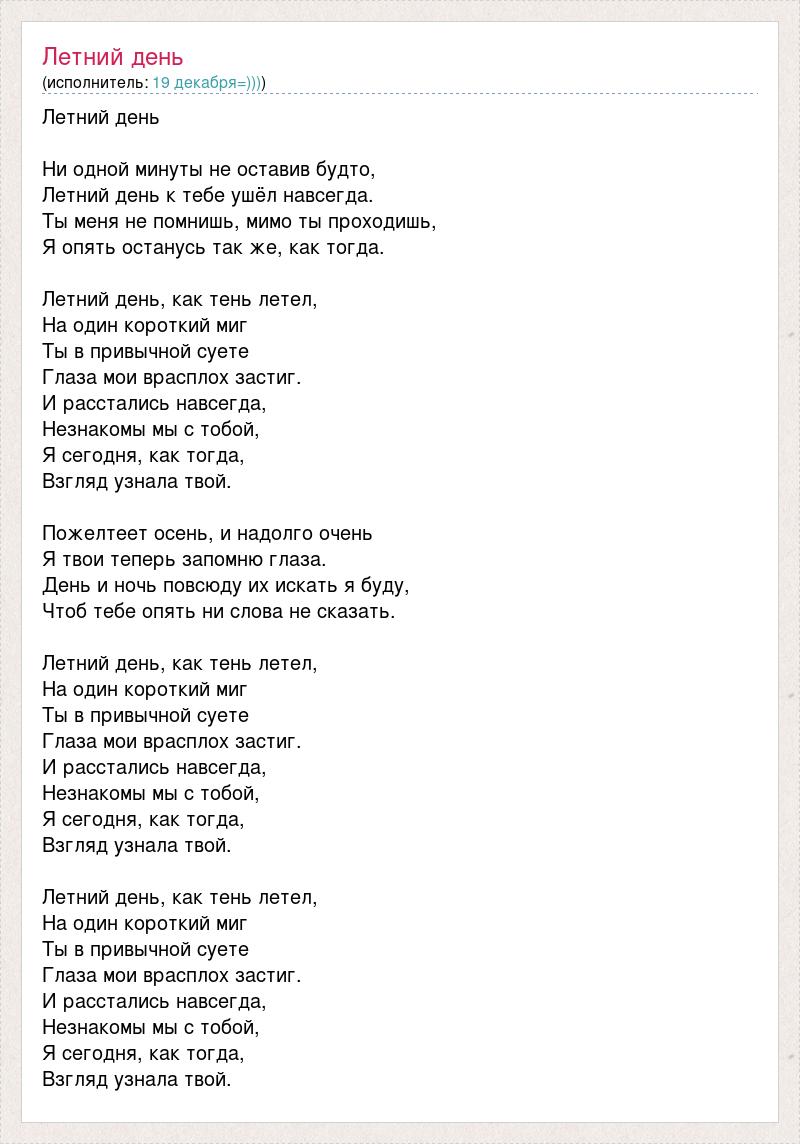Летний день Ни одной минуты не оставив будто, Летний день к тебе ушёл навсегда. Ты меня не помнишь, мимо ты проходишь, Я опять останусь так же, как тогда. Летний день, как тень летел, На один короткий миг Ты в привычной суете Глаза мои врасплох застиг. И расстались навсегда, Незнакомы мы с тобой, Я сегодня, как тогда, Взгляд узнала твой. Пожелтеет осень, и надолго очень Я твои теперь запомню глаза. День и ночь повсюду их искать я буду, Чтоб тебе опять ни слова не сказать. Летний день, как тень летел, На один короткий миг Ты в привычной суете Глаза мои врасплох застиг. И расстались навсегда, Незнакомы мы с тобой, Я сегодня, как тогда, Взгляд узнала твой. Летний день, как тень летел, На один короткий миг Ты в привычной суете Глаза мои врасплох застиг. И расстались навсегда, Незнакомы мы с тобой, Я сегодня, как тогда, Взгляд узнала твой.