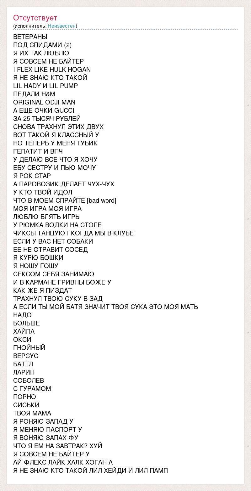ВЕТЕРАНЫ ПОД СПИДАМИ (2) Я ИХ ТАК ЛЮБЛЮ Я СОВСЕМ НЕ БАЙТЕР I FLEX LIKE HULK HOGAN Я НЕ ЗНАЮ КТО ТАКОЙ LIL HADY И LIL PUMP ПЕДАЛИ H&M ORIGINAL ODJI MAN А ЕЩЕ ОЧКИ GUCCI ЗА 25 ТЫСЯЧ РУБЛЕЙ СНОВА ТРАХНУЛ ЭТИХ ДВУХ ВОТ ТАКОЙ Я КЛАССНЫЙ У НО ТЕПЕРЬ У МЕНЯ ТУБИК ГЕПАТИТ И ВПЧ У ДЕЛАЮ ВСЕ ЧТО Я ХОЧУ ЕБУ СЕСТРУ И ПЬЮ МОЧУ Я РОК СТАР А ПАРОВОЗИК ДЕЛАЕТ ЧУХ-ЧУХ У КТО ТВОЙ ИДОЛ ЧТО В МОЕМ СПРАЙТЕ [bad word] МОЯ ИГРА МОЯ ИГРА ЛЮБЛЮ БЛЯТЬ ИГРЫ У РЮМКА ВОДКИ НА СТОЛЕ ЧИКСЫ ТАНЦУЮТ КОГДА МЫ В КЛУБЕ ЕСЛИ У ВАС НЕТ СОБАКИ ЕЕ НЕ ОТРАВИТ СОСЕД Я КУРЮ БОШКИ Я НОШУ ГОШУ СЕКСОМ СЕБЯ ЗАНИМАЮ И В КАРМАНЕ ГРИВНЫ БОЖЕ У КАК ЖЕ Я ПИЗДАТ ТРАХНУЛ ТВОЮ СУКУ В ЗАД А ЕСЛИ ТЫ МОЙ БАТЯ ЗНАЧИТ ТВОЯ СУКА ЭТО МОЯ МАТЬ НАДО БОЛЬШЕ ХАЙПА ОКСИ ГНОЙНЫЙ ВЕРСУС БАТТЛ ЛАРИН СОБОЛЕВ С ГУРАМОМ ПОРНО СИСЬКИ ТВОЯ МАМА Я РОНЯЮ ЗАПАД У Я МЕНЯЮ ПАСПОРТ У Я ВОНЯЮ ЗАПАХ ФУ ЧТО Я ЕМ НА ЗАВТРАК? ХУЙ Я СОВСЕМ НЕ БАЙТЕР У АЙ ФЛЕКС ЛАЙК ХАЛК ХОГАН А Я НЕ ЗНАЮ КТО ТАКОЙ ЛИЛ ХЕЙДИ И ЛИЛ ПАМП