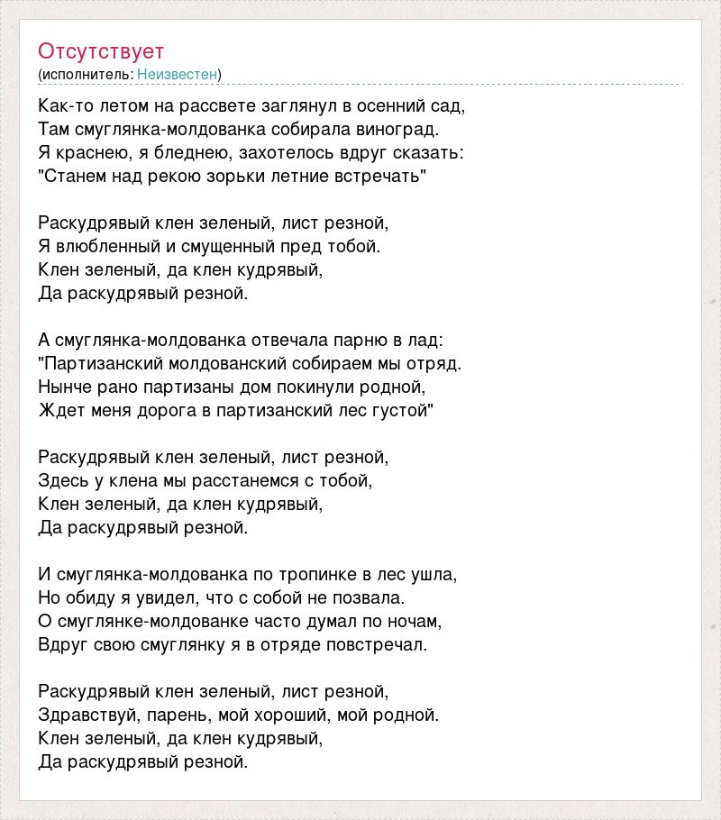 Как-то летом на рассвете заглянул в осенний сад, Там смуглянка-молдованка собирала виноград. Я краснею, я бледнею, захотелось вдруг сказать: "Станем над рекою зорьки летние встречать" Раскудрявый клен зеленый, лист резной, Я влюбленный и смущенный пред тобой. Клен зеленый, да клен кудрявый, Да раскудрявый резной. А смуглянка-молдованка отвечала парню в лад: "Партизанский молдованский собираем мы отряд. Нынче рано партизаны дом покинули родной, Ждет меня дорога в партизанский лес густой" Раскудрявый клен зеленый, лист резной, Здесь у клена мы расстанемся с тобой, Клен зеленый, да клен кудрявый, Да раскудрявый резной. И смуглянка-молдованка по тропинке в лес ушла, Но обиду я увидел, что с собой не позвала. О смуглянке-молдованке часто думал по ночам, Вдруг свою смуглянку я в отряде повстречал. Раскудрявый клен зеленый, лист резной, Здравствуй, парень, мой хороший, мой родной. Клен зеленый, да клен кудрявый, Да раскудрявый резной.