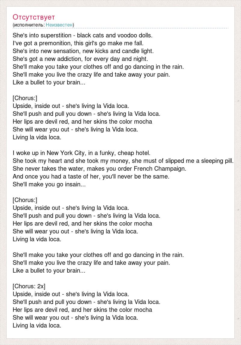 She's into superstition - black cats and voodoo dolls. I've got a premonition, this girl's go make me fall. She's into new sensation, new kicks and candle light. She's got a new addiction, for every day and night. She'll make you take your clothes off and go dancing in the rain. She'll make you live the crazy life and take away your pain. Like a bullet to your brain... [Chorus:] Upside, inside out - she's living la Vida loca. She'll push and pull you down - she's living la Vida loca. Her lips are devil red, and her skins the color mocha She will wear you out - she's living la Vida loca. Living la vida loca. I woke up in New York City, in a funky, cheap hotel. She took my heart and she took my money, she must of slipped me a sleeping pill. She never takes the water, makes you order French Champaign. And once you had a taste of her, you'll never be the same. She'll make you go insain... [Chorus:] Upside, inside out - she's living la Vida loca. She'll push and pull you down - she's living la Vida loca. Her lips are devil red, and her skins the color mocha She will wear you out - she's living la Vida loca. Living la vida loca. She'll make you take your clothes off and go dancing in the rain. She'll make you live the crazy life and take away your pain. Like a bullet to your brain... [Chorus: 2x] Upside, inside out - she's living la Vida loca. She'll push and pull you down - she's living la Vida loca. Her lips are devil red, and her skins the color mocha She will wear you out - she's living la Vida loca. Living la vida loca.