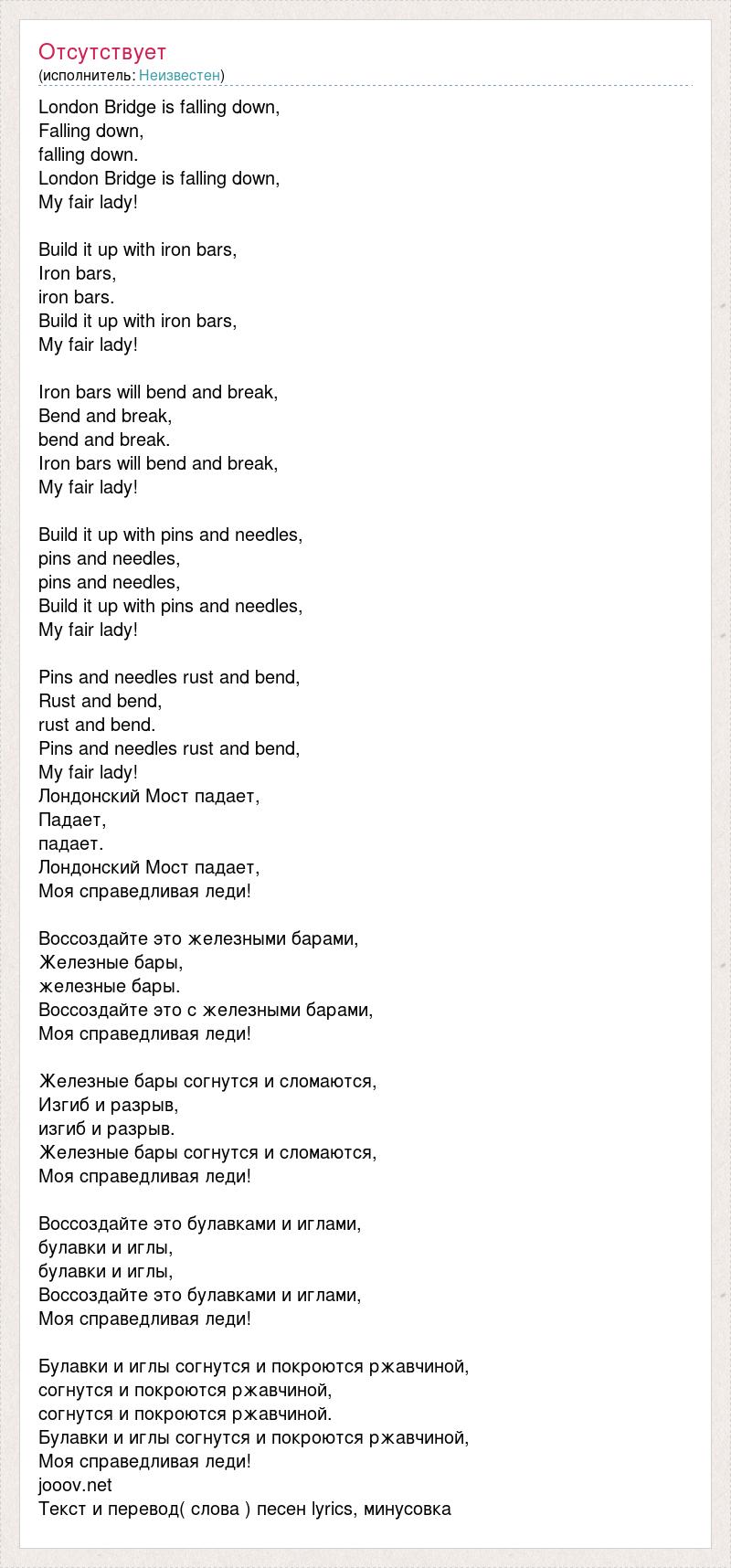 London Bridge is falling down, Falling down, falling down. London Bridge is falling down, My fair lady! Build it up with iron bars, Iron bars, iron bars. Build it up with iron bars, My fair lady! Iron bars will bend and break, Bend and break, bend and break. Iron bars will bend and break, My fair lady! Build it up with pins and needles, pins and needles, pins and needles, Build it up with pins and needles, My fair lady! Pins and needles rust and bend, Rust and bend, rust and bend. Pins and needles rust and bend, My fair lady! Лондонский Мост падает, Падает, падает. Лондонский Мост падает, Моя справедливая леди! Воссоздайте это железными барами, Железные бары, железные бары. Воссоздайте это с железными барами, Моя справедливая леди! Железные бары согнутся и сломаются, Изгиб и разрыв, изгиб и разрыв. Железные бары согнутся и сломаются, Моя справедливая леди! Воссоздайте это булавками и иглами, булавки и иглы, булавки и иглы, Воссоздайте это булавками и иглами, Моя справедливая леди! Булавки и иглы согнутся и покроются ржавчиной, согнутся и покроются ржавчиной, согнутся и покроются ржавчиной. Булавки и иглы согнутся и покроются ржавчиной, Моя справедливая леди! jooov.net Текст и перевод( слова ) песен lyrics, минусовка