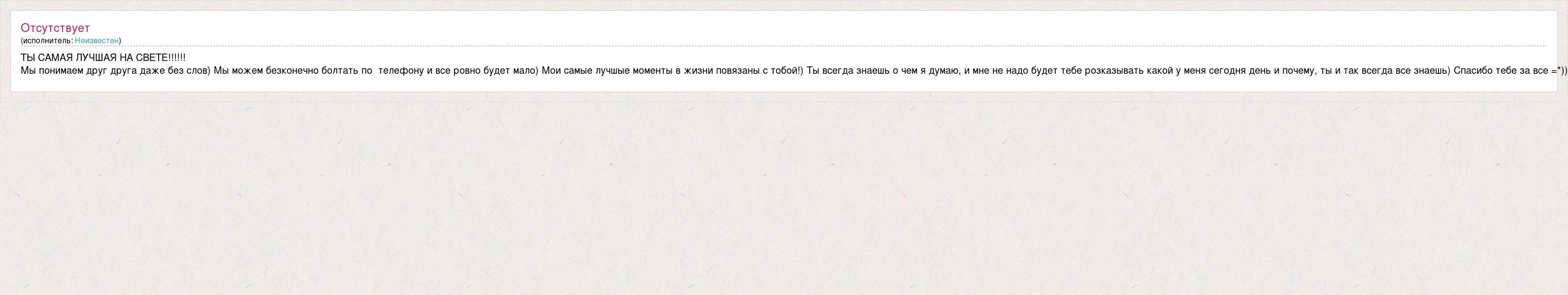 ТЫ САМАЯ ЛУЧШАЯ НА СВЕТЕ!!!!!! Мы понимаем друг друга даже без слов) Мы можем безконечно болтать по телефону и все ровно будет мало) Мои самые лучшые моменты в жизни повязаны с тобой!) Ты всегда знаешь о чем я думаю, и мне не надо будет тебе розказывать какой у меня сегодня день и почему, ты и так всегда все знаешь) Спасибо тебе за все =*))