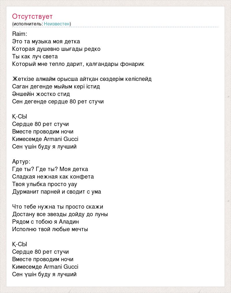 Raim: Это та музыка моя детка Которая душевно шығады редко Ты как луч света Который мне тепло дарит, қалғандары фонарик Жеткізе алмайм орысша айтқан сөздерім келіспейд Саған дегенде мыйым кері істид Әншейін жостко стид Сен дегенде сердце 80 рет стучи Қ-СЫ Сердце 80 рет стучи Вместе проводим ночи Кимесемде Armani Gucci Сен үшін буду я лучший Артур: Где ты? Где ты? Моя детка Сладкая нежная как конфета Твоя улыбка просто уау Дурманит парней и сводит с ума Что тебе нужна ты просто скажи Достану все звезды дойду до луны Рядом с тобою я Аладин Исполню твой любые мечты Қ-СЫ Сердце 80 рет стучи Вместе проводим ночи Кимесемде Armani Gucci Сен үшін буду я лучший