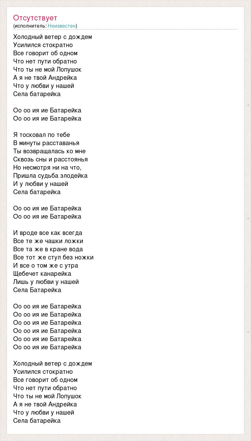 Холодный ветер с дождем Усилился стократно Все говорит об одном Что нет пути обратно Что ты не мой Лопушок А я не твой Андрейка Что у любви у нашей Села батарейка Оо оо ия ие Батарейка Оо оо ия ие Батарейка Я тосковал по тебе В минуты расставанья Ты возвращалась ко мне Сквозь сны и расстоянья Но несмотря ни на что, Пришла судьба злодейка И у любви у нашей Села батарейка Оо оо ия ие Батарейка Оо оо ия ие Батарейка И вроде все как всегда Все те же чашки ложки Все та же в кране вода Все тот же стул без ножки И все о том же с утра Щебечет канарейка Лишь у любви у нашей Села Батарейка Оо оо ия ие Батарейка Оо оо ия ие Батарейка Оо оо ия ие Батарейка Оо оо ия ие Батарейка Оо оо ия ие Батарейка Оо оо ия ие Батарейка Холодный ветер с дождем Усилился стократно Все говорит об одном Что нет пути обратно Что ты не мой Лопушок А я не твой Андрейка Что у любви у нашей Села батарейка