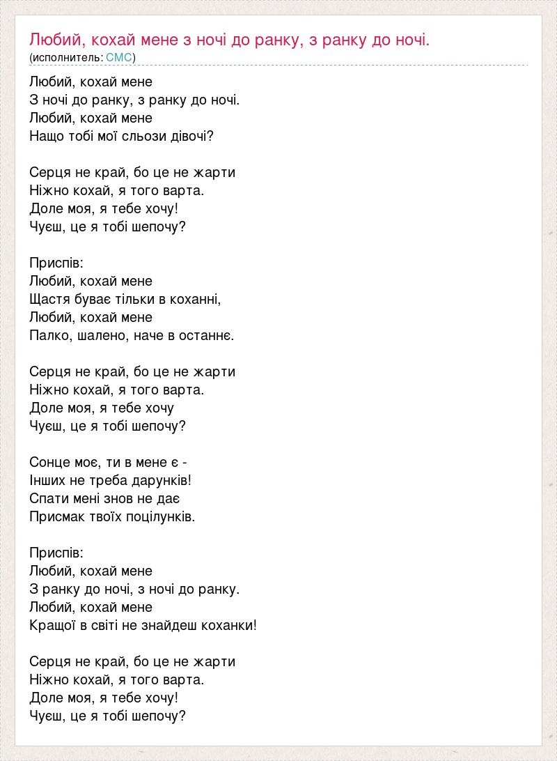 Любий, кохай мене З ночі до ранку, з ранку до ночі. Любий, кохай мене Нащо тобі мої сльози дівочі? Серця не край, бо це не жарти Ніжно кохай, я того варта. Доле моя, я тебе хочу! Чуєш, це я тобі шепочу? Приспів: Любий, кохай мене Щастя буває тільки в коханні, Любий, кохай мене Палко, шалено, наче в останнє. Серця не край, бо це не жарти Ніжно кохай, я того варта. Доле моя, я тебе хочу Чуєш, це я тобі шепочу? Сонце моє, ти в мене є - Інших не треба дарунків! Спати мені знов не дає Присмак твоїх поцілунків. Приспів: Любий, кохай мене З ранку до ночі, з ночі до ранку. Любий, кохай мене Кращої в світі не знайдеш коханки! Серця не край, бо це не жарти Ніжно кохай, я того варта. Доле моя, я тебе хочу! Чуєш, це я тобі шепочу?