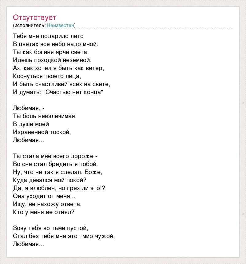 Тебя мне подарило лето В цветах все небо надо мной. Ты как богиня ярче света Идешь походкой неземной. Ах, как хотел я быть как ветер, Коснуться твоего лица, И быть счастливей всех на свете, И думать: "Счастью нет конца" Любимая, - Ты боль неизлечимая. В душе моей Израненной тоской, Любимая... Ты стала мне всего дороже - Во сне стал бредить я тобой. Ну, что не так я сделал, Боже, Куда девался мой покой? Да, я влюблен, но грех ли это!? Она уходит от меня... Ищу, не нахожу ответа, Кто у меня ее отнял? Зову тебя во тьме пустой, Стал без тебя мне этот мир чужой, Любимая...