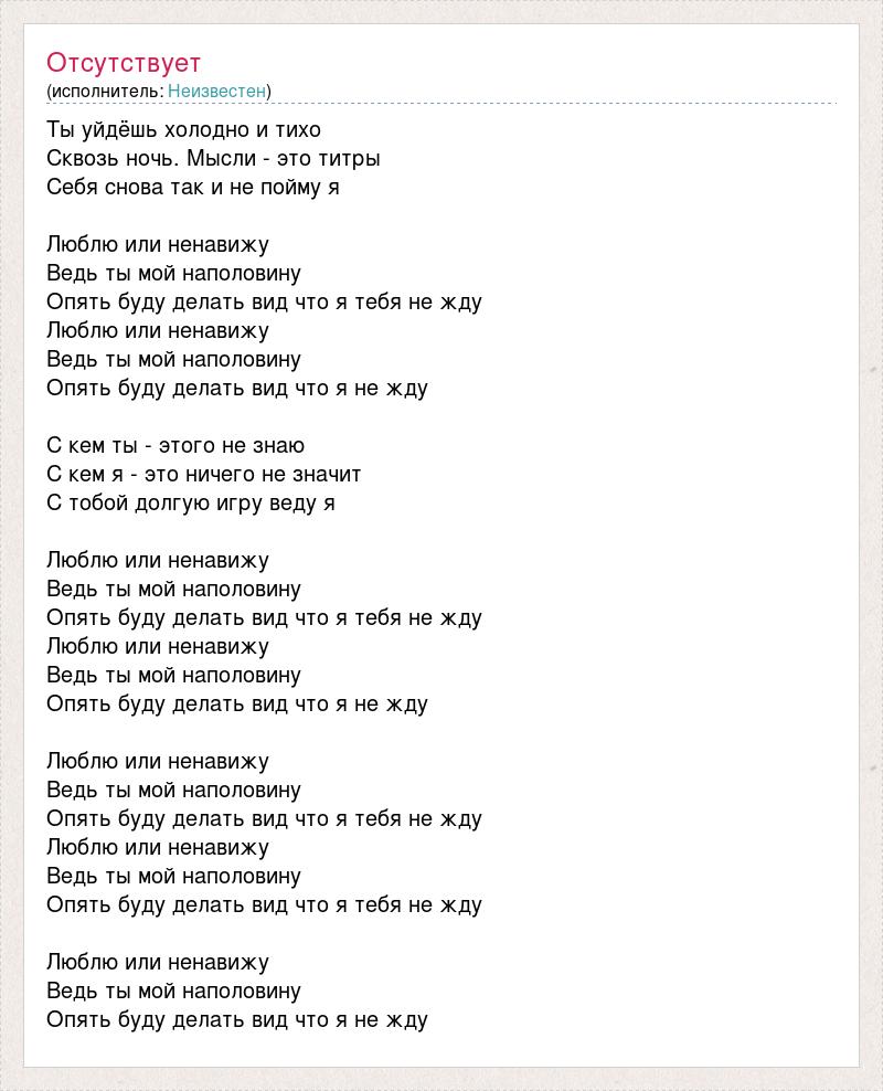 Ты уйдёшь холодно и тихо Сквозь ночь. Мысли - это титры Себя снова так и не пойму я Люблю или ненавижу Ведь ты мой наполовину Опять буду делать вид что я тебя не жду Люблю или ненавижу Ведь ты мой наполовину Опять буду делать вид что я не жду С кем ты - этого не знаю С кем я - это ничего не значит С тобой долгую игру веду я Люблю или ненавижу Ведь ты мой наполовину Опять буду делать вид что я тебя не жду Люблю или ненавижу Ведь ты мой наполовину Опять буду делать вид что я не жду Люблю или ненавижу Ведь ты мой наполовину Опять буду делать вид что я тебя не жду Люблю или ненавижу Ведь ты мой наполовину Опять буду делать вид что я тебя не жду Люблю или ненавижу Ведь ты мой наполовину Опять буду делать вид что я не жду