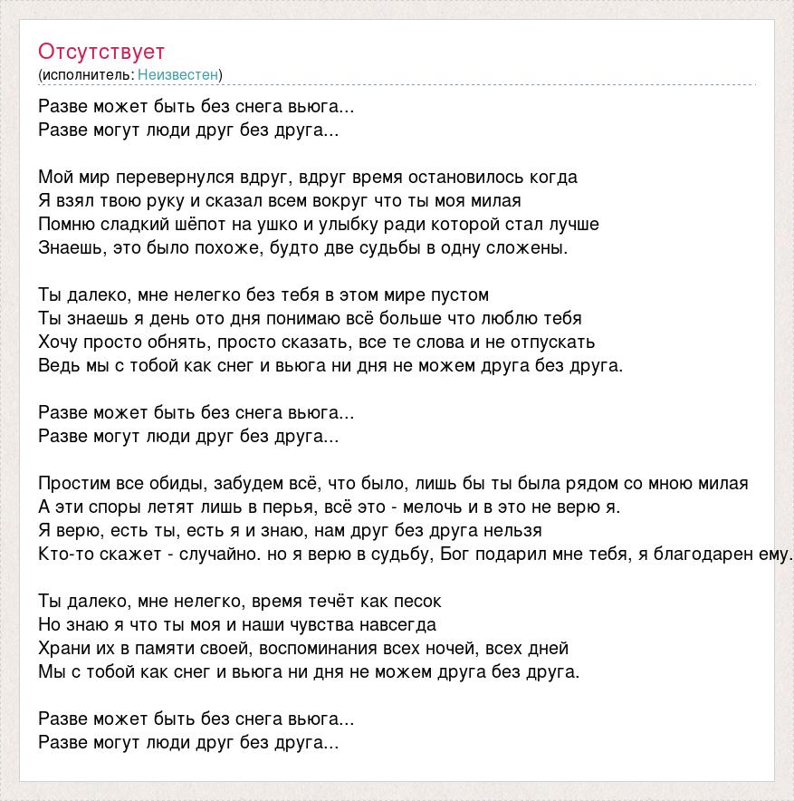 Разве может быть без снега вьюга... Разве могут люди друг без друга... Мой мир перевернулся вдруг, вдруг время остановилось когда Я взял твою руку и сказал всем вокруг что ты моя милая Помню сладкий шёпот на ушко и улыбку ради которой стал лучше Знаешь, это было похоже, будто две судьбы в одну сложены. Ты далеко, мне нелегко без тебя в этом мире пустом Ты знаешь я день ото дня понимаю всё больше что люблю тебя Хочу просто обнять, просто сказать, все те слова и не отпускать Ведь мы с тобой как снег и вьюга ни дня не можем друга без друга. Разве может быть без снега вьюга... Разве могут люди друг без друга... Простим все обиды, забудем всё, что было, лишь бы ты была рядом со мною милая А эти споры летят лишь в перья, всё это - мелочь и в это не верю я. Я верю, есть ты, есть я и знаю, нам друг без друга нельзя Кто-то скажет - случайно. но я верю в судьбу, Бог подарил мне тебя, я благодарен ему. Ты далеко, мне нелегко, время течёт как песок Но знаю я что ты моя и наши чувства навсегда Храни их в памяти своей, воспоминания всех ночей, всех дней Мы с тобой как снег и вьюга ни дня не можем друга без друга. Разве может быть без снега вьюга... Разве могут люди друг без друга...