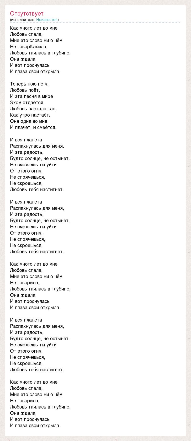 Как много лет во мне Любовь спала, Мне это слово ни о чём Не говорКакило, Любовь таилась в глубине, Она ждала, И вот проснулась И глаза свои открыла. Теперь пою не я, Любовь поёт, И эта песня в мире Эхом отдаётся. Любовь настала так, Как утро настаёт, Она одна во мне И плачет, и смеётся. И вся планета Распахнулась для меня, И эта радость, Будто солнце, не остынет. Не сможешь ты уйти От этого огня, Не спрячешься, Не скроешься, Любовь тебя настигнет. И вся планета Распахнулась для меня, И эта радость, Будто солнце, не остынет. Не сможешь ты уйти От этого огня, Не спрячешься, Не скроешься, Любовь тебя настигнет. Как много лет во мне Любовь спала, Мне это слово ни о чём Не говорило, Любовь таилась в глубине, Она ждала, И вот проснулась И глаза свои открыла. И вся планета Распахнулась для меня, И эта радость, Будто солнце, не остынет. Не сможешь ты уйти От этого огня, Не спрячешься, Не скроешься, Любовь тебя настигнет. Как много лет во мне Любовь спала, Мне это слово ни о чём Не говорило, Любовь таилась в глубине, Она ждала, И вот проснулась И глаза свои открыла.