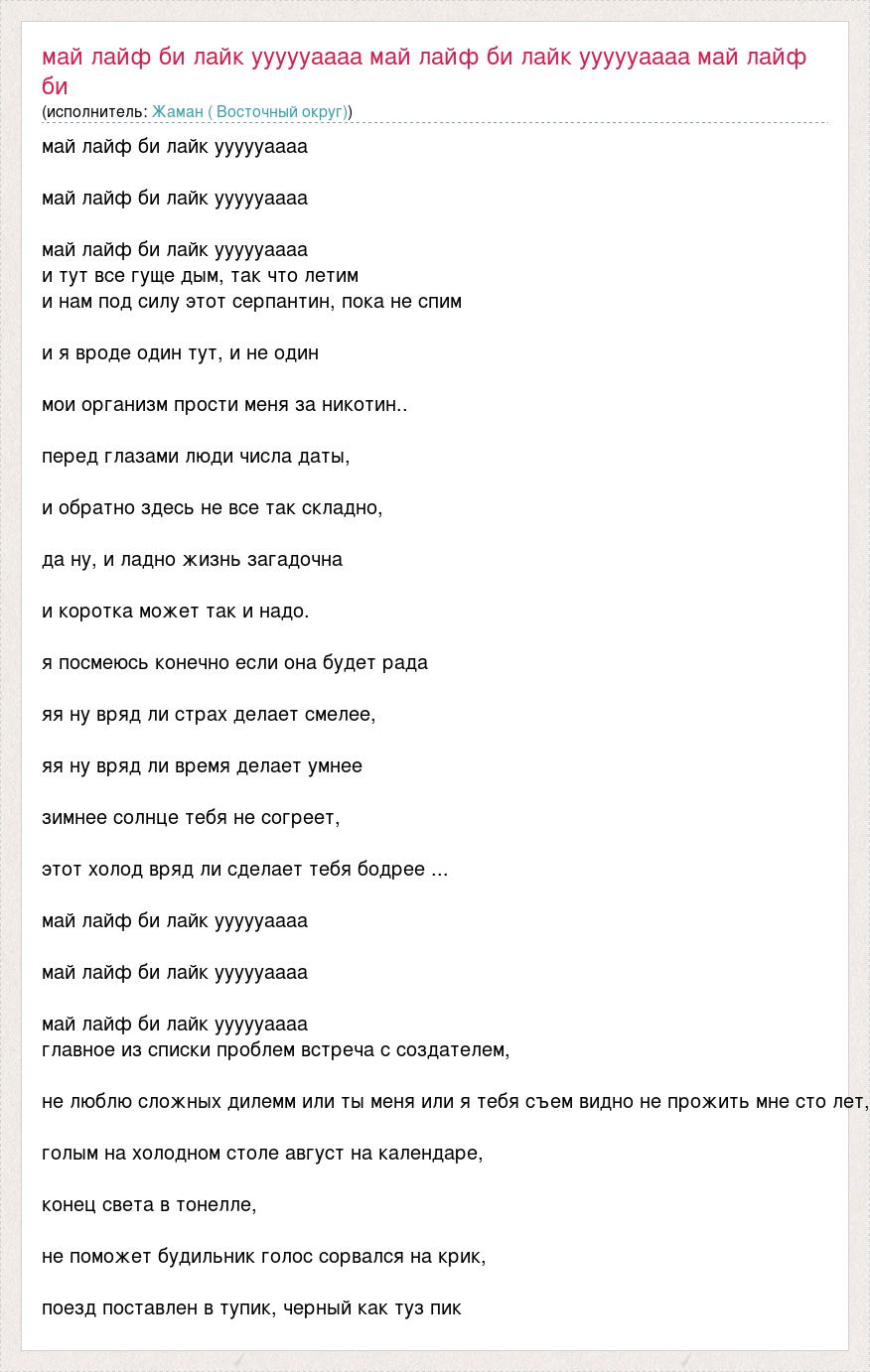 май лайф би лайк уууууаааа май лайф би лайк уууууаааа май лайф би лайк уууууаааа и тут все гуще дым, так что летим и нам под силу этот серпантин, пока не спим и я вроде один тут, и не один мои организм прости меня за никотин.. перед глазами люди числа даты, и обратно здесь не все так складно, да ну, и ладно жизнь загадочна и коротка может так и надо. я посмеюсь конечно если она будет рада яя ну вряд ли страх делает смелее, яя ну вряд ли время делает умнее зимнее солнце тебя не согреет, этот холод вряд ли сделает тебя бодрее ... май лайф би лайк уууууаааа май лайф би лайк уууууаааа май лайф би лайк уууууаааа главное из списки проблем встреча с создателем, не люблю сложных дилемм или ты меня или я тебя съем видно не прожить мне сто лет, голым на холодном столе август на календаре, конец света в тонелле, не поможет будильник голос сорвался на крик, поезд поставлен в тупик, черный как туз пик