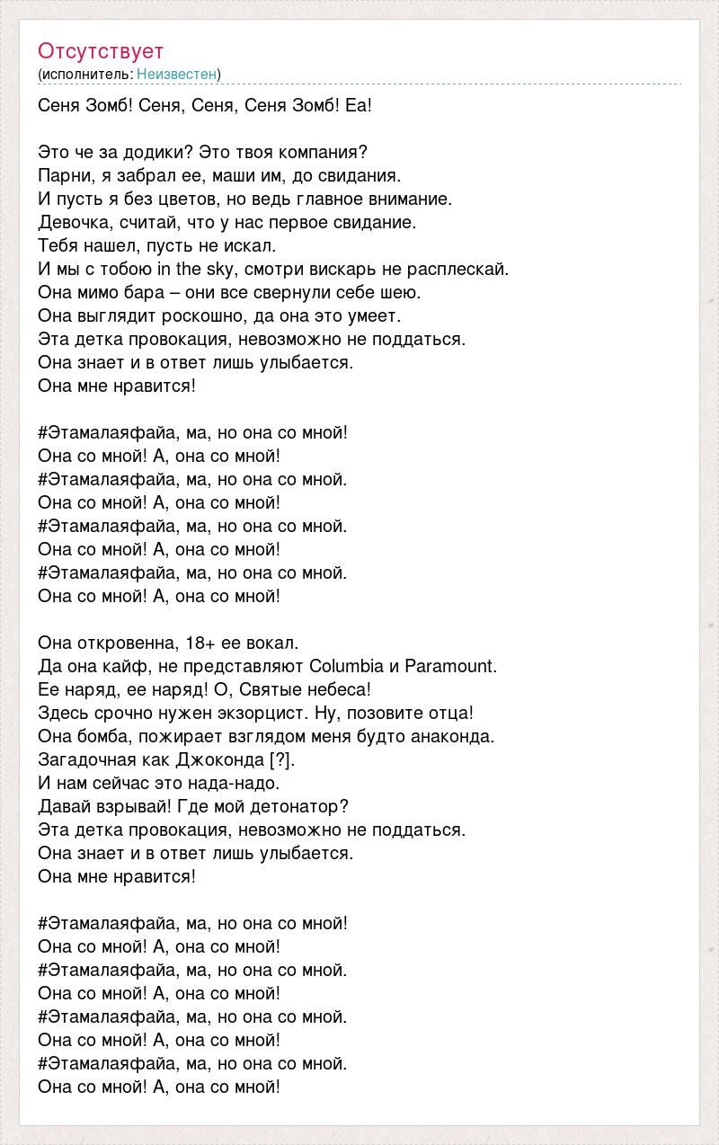 Сеня Зомб! Сеня, Сеня, Сеня Зомб! Еа! Это че за додики? Это твоя компания? Парни, я забрал ее, маши им, до свидания. И пусть я без цветов, но ведь главное внимание. Девочка, считай, что у нас первое свидание. Тебя нашел, пусть не искал. И мы с тобою in the sky, смотри вискарь не расплескай. Она мимо бара – они все свернули себе шею. Она выглядит роскошно, да она это умеет. Эта детка провокация, невозможно не поддаться. Она знает и в ответ лишь улыбается. Она мне нравится! #Этамалаяфайа, ма, но она со мной! Она со мной! А, она со мной! #Этамалаяфайа, ма, но она со мной. Она со мной! А, она со мной! #Этамалаяфайа, ма, но она со мной. Она со мной! А, она со мной! #Этамалаяфайа, ма, но она со мной. Она со мной! А, она со мной! Она откровенна, 18+ ее вокал. Да она кайф, не представляют Columbia и Paramount. Ее наряд, ее наряд! О, Святые небеса! Здесь срочно нужен экзорцист. Ну, позовите отца! Она бомба, пожирает взглядом меня будто анаконда. Загадочная как Джоконда [?]. И нам сейчас это нада-надо. Давай взрывай! Где мой детонатор? Эта детка провокация, невозможно не поддаться. Она знает и в ответ лишь улыбается. Она мне нравится! #Этамалаяфайа, ма, но она со мной! Она со мной! А, она со мной! #Этамалаяфайа, ма, но она со мной. Она со мной! А, она со мной! #Этамалаяфайа, ма, но она со мной. Она со мной! А, она со мной! #Этамалаяфайа, ма, но она со мной. Она со мной! А, она со мной!