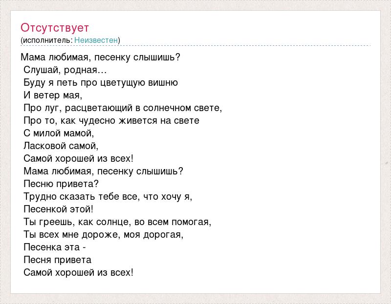 Мама любимая, песенку слышишь? Слушай, родная… Буду я петь про цветущую вишню И ветер мая, Про луг, расцветающий в солнечном свете, Про то, как чудесно живется на свете С милой мамой, Ласковой самой, Самой хорошей из всех! Мама любимая, песенку слышишь? Песню привета? Трудно сказать тебе все, что хочу я, Песенкой этой! Ты греешь, как солнце, во всем помогая, Ты всех мне дороже, моя дорогая, Песенка эта - Песня привета Самой хорошей из всех!