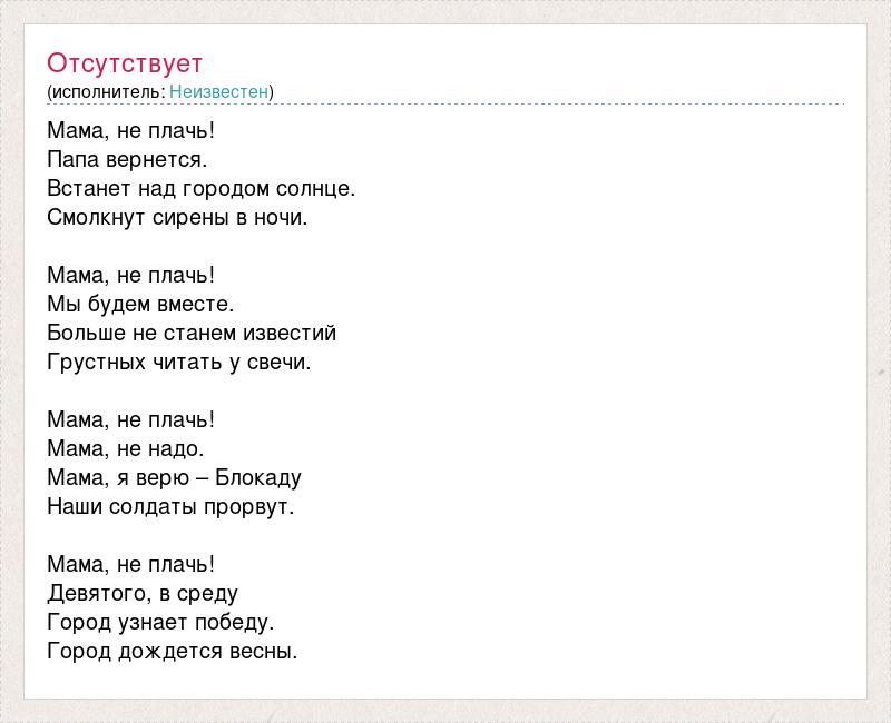 Мама, не плачь! Папа вернется. Встанет над городом солнце. Смолкнут сирены в ночи. Мама, не плачь! Мы будем вместе. Больше не станем известий Грустных читать у свечи. Мама, не плачь! Мама, не надо. Мама, я верю – Блокаду Наши солдаты прорвут. Мама, не плачь! Девятого, в среду Город узнает победу. Город дождется весны.