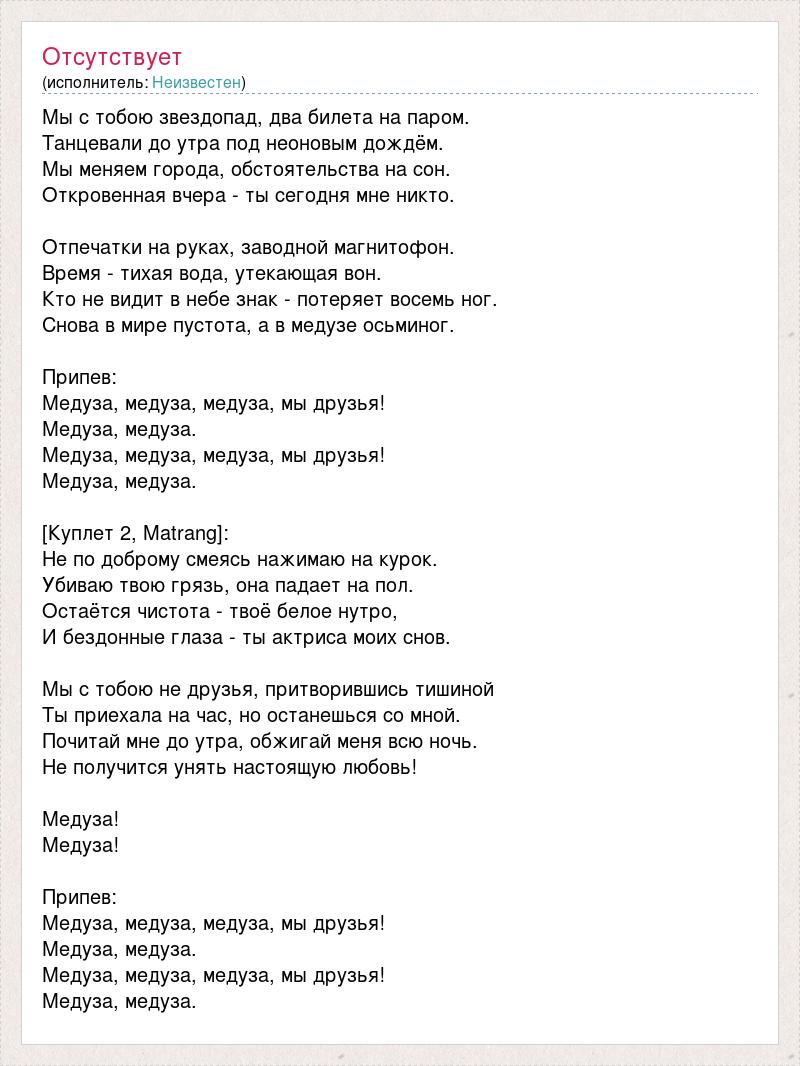 Мы с тобою звездопад, два билета на паром. Танцевали до утра под неоновым дождём. Мы меняем города, обстоятельства на сон. Откровенная вчера - ты сегодня мне никто. Отпечатки на руках, заводной магнитофон. Время - тихая вода, утекающая вон. Кто не видит в небе знак - потеряет восемь ног. Снова в мире пустота, а в медузе осьминог. Припев: Медуза, медуза, медуза, мы друзья! Медуза, медуза. Медуза, медуза, медуза, мы друзья! Медуза, медуза. [Куплет 2, Matrang]: Не по доброму смеясь нажимаю на курок. Убиваю твою грязь, она падает на пол. Остаётся чистота - твоё белое нутро, И бездонные глаза - ты актриса моих снов. Мы с тобою не друзья, притворившись тишиной Ты приехала на час, но останешься со мной. Почитай мне до утра, обжигай меня всю ночь. Не получится унять настоящую любовь! Медуза! Медуза! Припев: Медуза, медуза, медуза, мы друзья! Медуза, медуза. Медуза, медуза, медуза, мы друзья! Медуза, медуза.