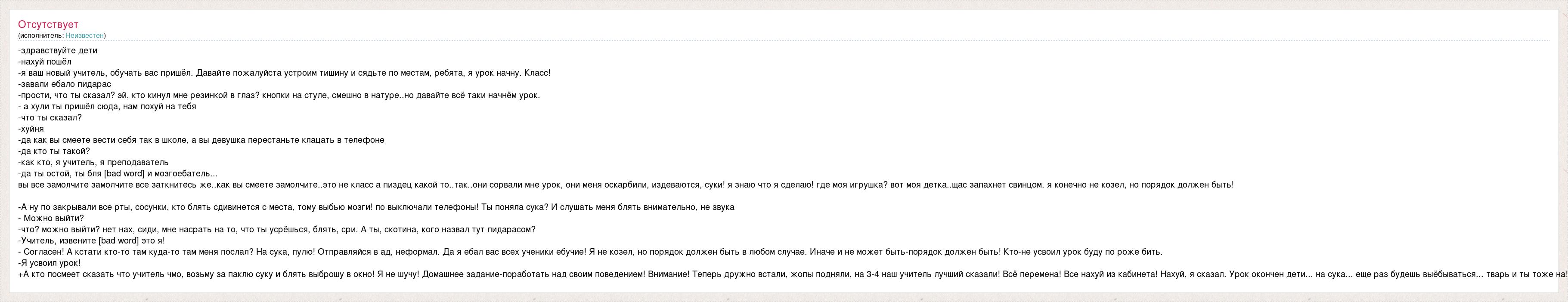 -здравствуйте дети -нахуй пошёл -я ваш новый учитель, обучать вас пришёл. Давайте пожалуйста устроим тишину и сядьте по местам, ребята, я урок начну. Класс! -завали ебало пидарас -прости, что ты сказал? эй, кто кинул мне резинкой в глаз? кнопки на стуле, смешно в натуре..но давайте всё таки начнём урок. - а хули ты пришёл сюда, нам похуй на тебя -что ты сказал? -хуйня -да как вы смеете вести себя так в школе, а вы девушка перестаньте клацать в телефоне -да кто ты такой? -как кто, я учитель, я преподаватель -да ты остой, ты бля [bad word] и мозгоебатель... вы все замолчите замолчите все заткнитесь же..как вы смеете замолчите..это не класс а пиздец какой то..так..они сорвали мне урок, они меня оскарбили, издеваются, суки! я знаю что я сделаю! где моя игрушка? вот моя детка..щас запахнет свинцом. я конечно не козел, но порядок должен быть! -А ну по закрывали все рты, сосунки, кто блять сдивинется с места, тому выбью мозги! по выключали телефоны! Ты поняла сука? И слушать меня блять внимательно, не звука - Можно выйти? -что? можно выйти? нет нах, сиди, мне насрать на то, что ты усрёшься, блять, сри. А ты, скотина, кого назвал тут пидарасом? -Учитель, извените [bad word] это я! - Согласен! А кстати кто-то там куда-то там меня послал? На сука, пулю! Отправляйся в ад, неформал. Да я ебал вас всех ученики ебучие! Я не козел, но порядок должен быть в любом случае. Иначе и не может быть-порядок должен быть! Кто-не усвоил урок буду по роже бить. -Я усвоил урок! +А кто посмеет сказать что учитель чмо, возьму за паклю суку и блять выброшу в окно! Я не шучу! Домашнее задание-поработать над своим поведением! Внимание! Теперь дружно встали, жопы подняли, на 3-4 наш учитель лучший сказали! Всё перемена! Все нахуй из кабинета! Нахуй, я сказал. Урок окончен дети... на сука... еще раз будешь выёбываться... тварь и ты тоже на!