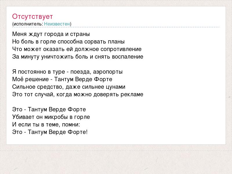 Меня ждут города и страны Но боль в горле способна сорвать планы Что может оказать ей должное сопротивление За минуту уничтожить боль и снять воспаление Я постоянно в туре - поезда, аэропорты Моё решение - Тантум Верде Форте Сильное средство, даже сильнее цунами Это тот случай, когда можно доверять рекламе Это - Тантум Верде Форте Убивает он микробы в горле И если ты в теме, помни: Это - Тантум Верде Форте!