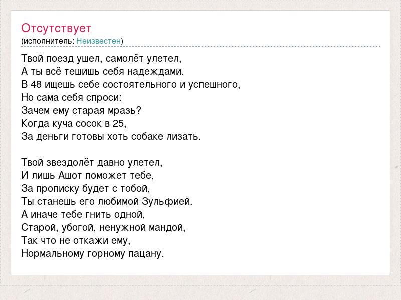 Твой поезд ушел, самолёт улетел, А ты всё тешишь себя надеждами. В 48 ищешь себе состоятельного и успешного, Но сама себя спроси: Зачем ему старая мразь? Когда куча сосок в 25, За деньги готовы хоть собаке лизать. Твой звездолёт давно улетел, И лишь Ашот поможет тебе, За прописку будет с тобой, Ты станешь его любимой Зульфией. А иначе тебе гнить одной, Старой, убогой, ненужной мандой, Так что не откажи ему, Нормальному горному пацану.