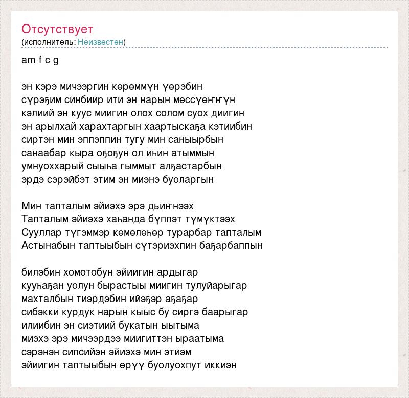 am f c g эн кэрэ мичээргин көрөммүн үөрэбин сүрэҕим синбиир ити эн нарын мөссүөҥҥүн кэлиий эн куус миигин олох солом суох диигин эн арылхай харахтаргын хаартыскаҕа кэтиибин сиртэн мин эппэппин тугу мин саныырбын санаабар кыра оҕоҕун ол иһин атыммын умнуоххарый сыыһа гыммыт алҕастарбын эрдэ сэрэйбэт этим эн миэнэ буоларгын Мин тапталым эйиэхэ эрэ дьиҥнээх Тапталым эйиэхэ хаһанда бүппэт түмүктээх Сууллар түгэммэр көмөлөһөр турарбар тапталым Астынабын таптыыбын сүтэриэхпин баҕарбаппын билэбин хомотобун эйиигин ардыгар кууһаҕан уолун бырастыы миигин тулуйарыгар махталбын тиэрдэбин ийэҕэр аҕаҕар сибэкки курдук нарын кыыс бу сиргэ баарыгар илиибин эн сиэтиий букатын ыытыма миэхэ эрэ мичээрдээ миигиттэн ыраатыма сэрэнэн сипсийэн эйиэхэ мин этиэм эйиигин таптыыбын өрүү буолуохпут иккиэн