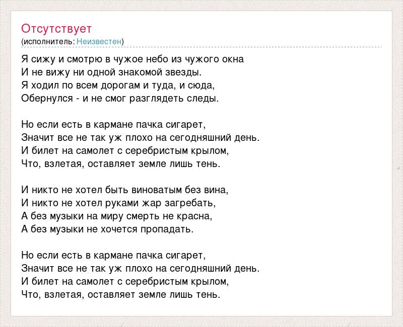 Я сижу и смотрю в чужое небо из чужого окна И не вижу ни одной знакомой звезды. Я ходил по всем дорогам и туда, и сюда, Обернулся - и не смог разглядеть следы. Но если есть в кармане пачка сигарет, Значит все не так уж плохо на сегодняшний день. И билет на самолет с серебристым крылом, Что, взлетая, оставляет земле лишь тень. И никто не хотел быть виноватым без вина, И никто не хотел руками жар загребать, А без музыки на миру смерть не красна, А без музыки не хочется пропадать. Но если есть в кармане пачка сигарет, Значит все не так уж плохо на сегодняшний день. И билет на самолет с серебристым крылом, Что, взлетая, оставляет земле лишь тень.