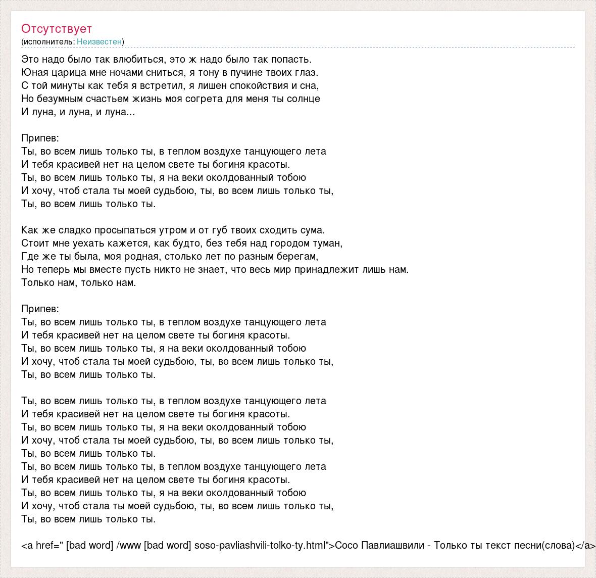Это надо было так влюбиться, это ж надо было так попасть. Юная царица мне ночами сниться, я тону в пучине твоих глаз. С той минуты как тебя я встретил, я лишен спокойствия и сна, Но безумным счастьем жизнь моя согрета для меня ты солнце И луна, и луна, и луна... Припев: Ты, во всем лишь только ты, в теплом воздухе танцующего лета И тебя красивей нет на целом свете ты богиня красоты. Ты, во всем лишь только ты, я на веки околдованный тобою И хочу, чтоб стала ты моей судьбою, ты, во всем лишь только ты, Ты, во всем лишь только ты. Как же сладко просыпаться утром и от губ твоих сходить сума. Стоит мне уехать кажется, как будто, без тебя над городом туман, Где же ты была, моя родная, столько лет по разным берегам, Но теперь мы вместе пусть никто не знает, что весь мир принадлежит лишь нам. Только нам, только нам. Припев: Ты, во всем лишь только ты, в теплом воздухе танцующего лета И тебя красивей нет на целом свете ты богиня красоты. Ты, во всем лишь только ты, я на веки околдованный тобою И хочу, чтоб стала ты моей судьбою, ты, во всем лишь только ты, Ты, во всем лишь только ты. Ты, во всем лишь только ты, в теплом воздухе танцующего лета И тебя красивей нет на целом свете ты богиня красоты. Ты, во всем лишь только ты, я на веки околдованный тобою И хочу, чтоб стала ты моей судьбою, ты, во всем лишь только ты, Ты, во всем лишь только ты. Ты, во всем лишь только ты, в теплом воздухе танцующего лета И тебя красивей нет на целом свете ты богиня красоты. Ты, во всем лишь только ты, я на веки околдованный тобою И хочу, чтоб стала ты моей судьбою, ты, во всем лишь только ты, Ты, во всем лишь только ты. <a href=" [bad word] /www [bad word] soso-pavliashvili-tolko-ty.html">Сосо Павлиашвили - Только ты текст песни(слова)</a>