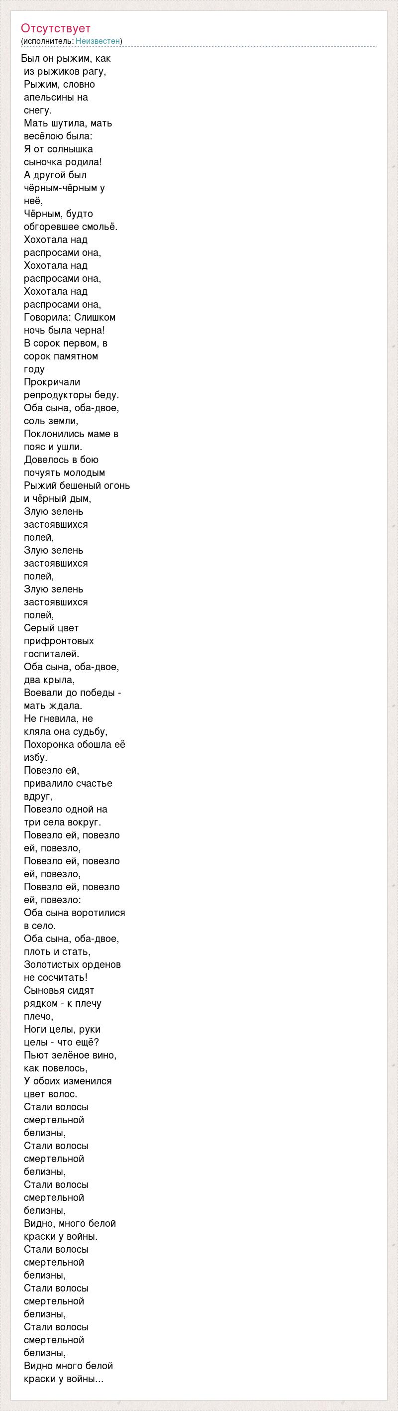 Был он рыжим, как из рыжиков рагу, Рыжим, словно апельсины на снегу. Мать шутила, мать весёлою была: Я от солнышка сыночка родила! А другой был чёрным-чёрным у неё, Чёрным, будто обгоревшее смольё. Хохотала над распросами она, Хохотала над распросами она, Хохотала над распросами она, Говорила: Слишком ночь была черна! В сорок первом, в сорок памятном году Прокричали репродукторы беду. Оба сына, оба-двое, соль земли, Поклонились маме в пояс и ушли. Довелось в бою почуять молодым Рыжий бешеный огонь и чёрный дым, Злую зелень застоявшихся полей, Злую зелень застоявшихся полей, Злую зелень застоявшихся полей, Серый цвет прифронтовых госпиталей. Оба сына, оба-двое, два крыла, Воевали до победы - мать ждала. Не гневила, не кляла она судьбу, Похоронка обошла её избу. Повезло ей, привалило счастье вдруг, Повезло одной на три села вокруг. Повезло ей, повезло ей, повезло, Повезло ей, повезло ей, повезло, Повезло ей, повезло ей, повезло: Оба сына воротилися в село. Оба сына, оба-двое, плоть и стать, Золотистых орденов не сосчитать! Сыновья сидят рядком - к плечу плечо, Ноги целы, руки целы - что ещё? Пьют зелёное вино, как повелось, У обоих изменился цвет волос. Стали волосы смертельной белизны, Стали волосы смертельной белизны, Стали волосы смертельной белизны, Видно, много белой краски у войны. Стали волосы смертельной белизны, Стали волосы смертельной белизны, Стали волосы смертельной белизны, Видно много белой краски у войны...