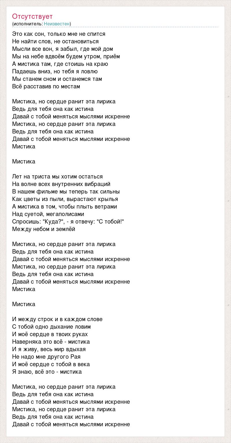 Это как сон, только мне не спится Не найти слов, не остановиться Мысли все вон, я забыл, где мой дом Мы на небе вдвоём будем утром, приём А мистика там, где стоишь на краю Падаешь вниз, но тебя я ловлю Мы станем сном и останемся там Всё расставив по местам Мистика, но сердце ранит эта лирика Ведь для тебя она как истина Давай с тобой меняться мыслями искренне Мистика, но сердце ранит эта лирика Ведь для тебя она как истина Давай с тобой меняться мыслями искренне Мистика Мистика Лет на триста мы хотим остаться На волне всех внутренних вибраций В нашем фильме мы теперь так сильны Как цветы из пыли, вырастают крылья А мистика в том, чтобы плыть ветрами Над суетой, мегаполисами Спросишь: "Куда?", - я отвечу: "С тобой!" Между небом и землёй Мистика, но сердце ранит эта лирика Ведь для тебя она как истина Давай с тобой меняться мыслями искренне Мистика, но сердце ранит эта лирика Ведь для тебя она как истина Давай с тобой меняться мыслями искренне Мистика Мистика И между строк и в каждом слове С тобой одно дыхание ловим И моё сердце в твоих руках Наверняка это всё - мистика И я живу, весь мир вдыхая Не надо мне другого Рая И моё сердце с тобой в века Я знаю, всё это - мистика Мистика, но сердце ранит эта лирика Ведь для тебя она как истина Давай с тобой меняться мыслями искренне Мистика, но сердце ранит эта лирика Ведь для тебя она как истина Давай с тобой меняться мыслями искренне