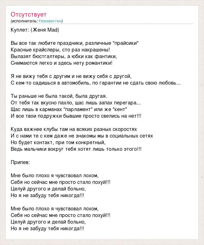 Куплет: (Женя Mad) Вы все так любите праздники, различные "прайсики" Красные крайслеры, сто раз накрашены! Вылазят бюстгалтеры, а юбки как фантики, Снимаются легко и здесь нету романтики! Я не вижу тебя с другим и не вижу себя с другой, С кем-то садишься в автомобиль, по гарантии не сдать свою любовь... Ты раньше не была такой, была другая. От тебя так вкусно пахло, щас лишь запах перегара... Щас лишь в карманах "парламент" или же "кент" И все твои подружки бывшие просто свелись на нет!!! Куда важнее клубы там на всяких разных скоростях И с нами те с кем даже не знакомы мы в социальных сетях Но будет контакт, при том конкретный, Ведь мальчики вокруг тебя хотят лишь только этого!!! Припев: Мне было плохо я чувствовал лохом, Себя но сейчас мне просто стало похуй!!! Целуй другого и делай больно, Но я не забуду тебя никогда!!! Мне было плохо я чувствовал лохом, Себя но сейчас мне просто стало похуй!!! Целуй другого и делай больно, Но я не забуду тебя никогда!!!