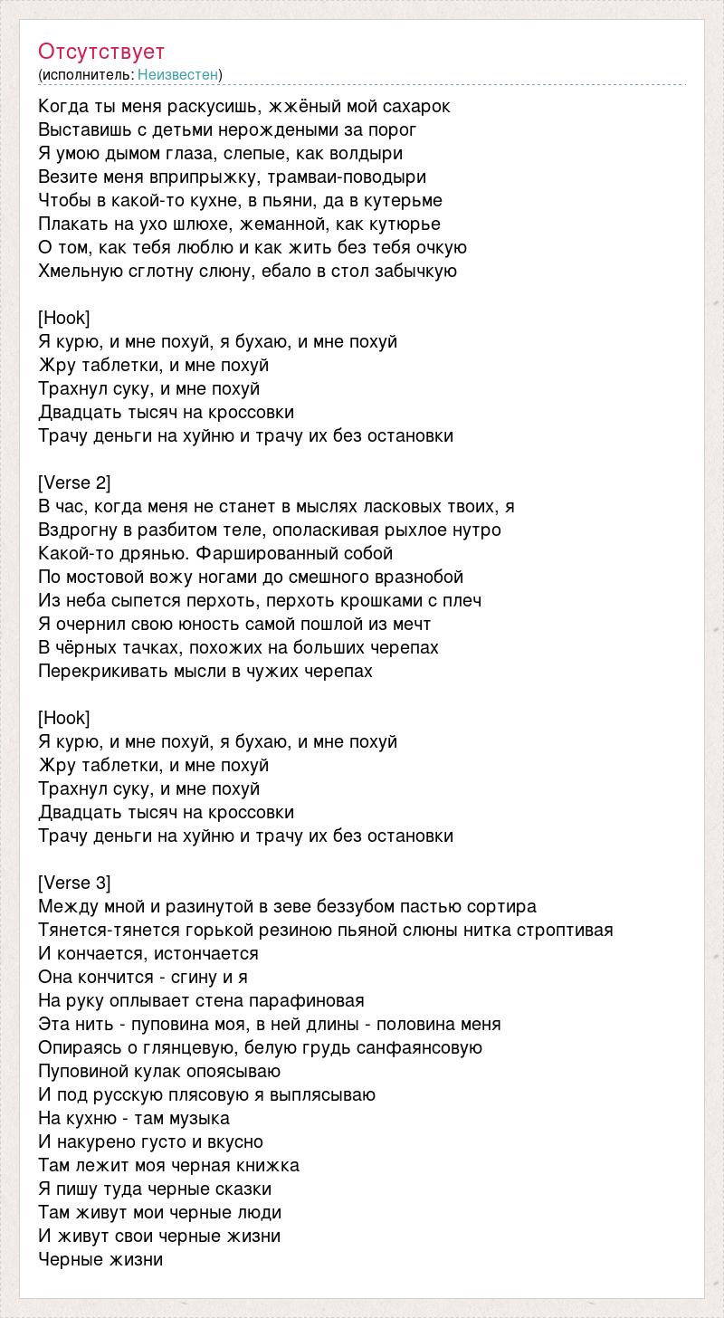 Когда ты меня раскусишь, жжёный мой сахарок Выставишь с детьми нерождеными за порог Я умою дымом глаза, слепые, как волдыри Везите меня вприпрыжку, трамваи-поводыри Чтобы в какой-то кухне, в пьяни, да в кутерьме Плакать на ухо шлюхе, жеманной, как кутюрье О том, как тебя люблю и как жить без тебя очкую Хмельную сглотну слюну, ебало в стол забычкую [Hook] Я курю, и мне похуй, я бухаю, и мне похуй Жру таблетки, и мне похуй Трахнул суку, и мне похуй Двадцать тысяч на кроссовки Трачу деньги на хуйню и трачу их без остановки [Verse 2] В час, когда меня не станет в мыслях ласковых твоих, я Вздрогну в разбитом теле, ополаскивая рыхлое нутро Какой-то дрянью. Фаршированный собой По мостовой вожу ногами до смешного вразнобой Из неба сыпется перхоть, перхоть крошками с плеч Я очернил свою юность самой пошлой из мечт В чёрных тачках, похожих на больших черепах Перекрикивать мысли в чужих черепах [Hook] Я курю, и мне похуй, я бухаю, и мне похуй Жру таблетки, и мне похуй Трахнул суку, и мне похуй Двадцать тысяч на кроссовки Трачу деньги на хуйню и трачу их без остановки [Verse 3] Между мной и разинутой в зеве беззубом пастью сортира Тянется-тянется горькой резиною пьяной слюны нитка строптивая И кончается, истончается Она кончится - сгину и я На руку оплывает стена парафиновая Эта нить - пуповина моя, в ней длины - половина меня Опираясь о глянцевую, белую грудь санфаянсовую Пуповиной кулак опоясываю И под русскую плясовую я выплясываю На кухню - там музыка И накурено густо и вкусно Там лежит моя черная книжка Я пишу туда черные сказки Там живут мои черные люди И живут свои черные жизни Черные жизни