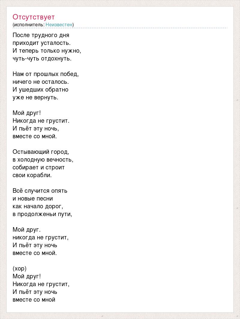 После трудного дня приходит усталость. И теперь только нужно, чуть-чуть отдохнуть. Нам от прошлых побед, ничего не осталось. И ушедших обратно уже не вернуть. Мой друг! Никогда не грустит. И пьёт эту ночь, вместе со мной. Остывающий город, в холодную вечность, собирает и строит свои корабли. Всё случится опять и новые песни как начало дорог, в продолженьи пути, Мой друг. никогда не грустит, И пьёт эту ночь вместе со мной. (хор) Мой друг! Никогда не грустит, И пьёт эту ночь вместе со мной