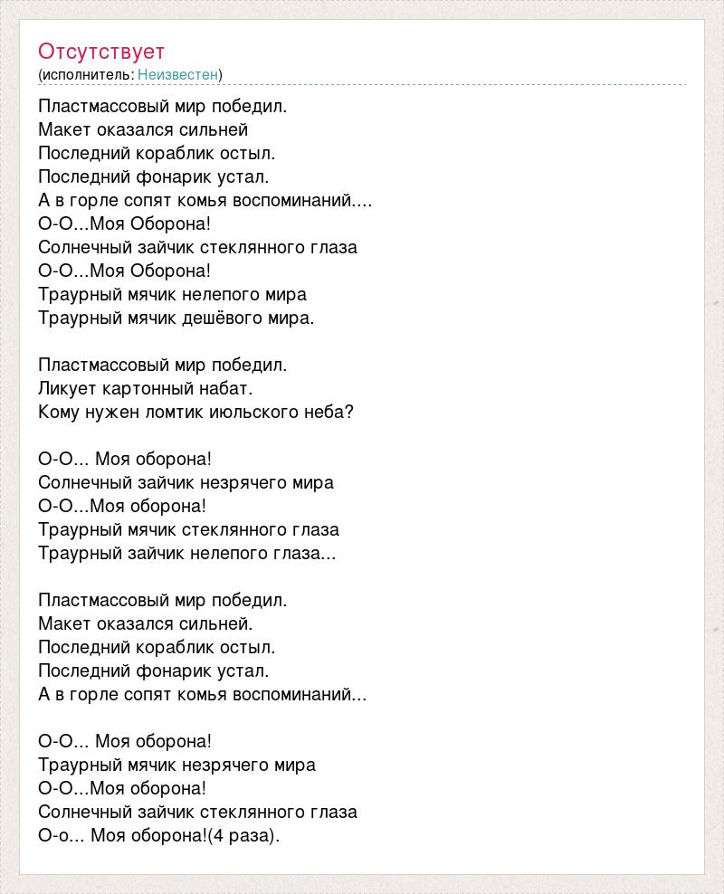 Пластмассовый мир победил. Макет оказался сильней Последний кораблик остыл. Последний фонарик устал. А в горле сопят комья воспоминаний.... О-О...Моя Оборона! Солнечный зайчик стеклянного глаза О-О...Моя Оборона! Траурный мячик нелепого мира Траурный мячик дешёвого мира. Пластмассовый мир победил. Ликует картонный набат. Кому нужен ломтик июльского неба? О-О... Моя оборона! Солнечный зайчик незрячего мира О-О...Моя оборона! Траурный мячик стеклянного глаза Траурный зайчик нелепого глаза... Пластмассовый мир победил. Макет оказался сильней. Последний кораблик остыл. Последний фонарик устал. А в горле сопят комья воспоминаний... О-О... Моя оборона! Траурный мячик незрячего мира О-О...Моя оборона! Солнечный зайчик стеклянного глаза О-о... Моя оборона!(4 раза).