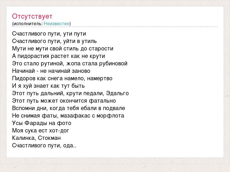 Счастливого пути, ути пути Счастливого пути, уйти в утиль Мути не мути свой стиль до старости А пидорастия растет как не крути Это стало рутиной, жопа стала рубиновой Начинай - не начинай заново Пидоров как снега намело, намертво И я хуй знает как тут быть Этот путь дальний, крути педали, Эдальго Этот путь может окончится фатально Вспомни дни, когда тебя ебали в подвале Не снимая фаты, мазафакас с морфлота Усы Фарады на фото Моя сука ест хот-дог Калинка, Стокман Счастливого пути, ода..