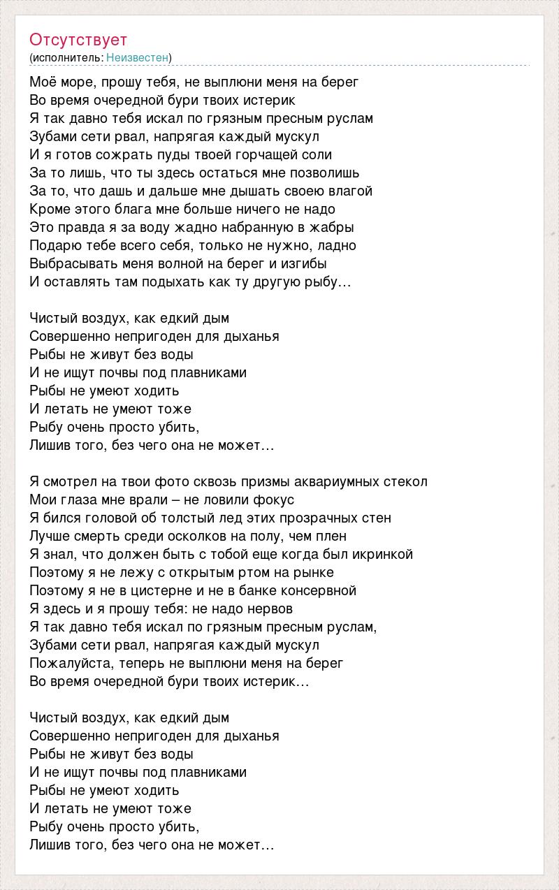 Моё море, прошу тебя, не выплюни меня на берег Во время очередной бури твоих истерик Я так давно тебя искал по грязным пресным руслам Зубами сети рвал, напрягая каждый мускул И я готов сожрать пуды твоей горчащей соли За то лишь, что ты здесь остаться мне позволишь За то, что дашь и дальше мне дышать своею влагой Кроме этого блага мне больше ничего не надо Это правда я за воду жадно набранную в жабры Подарю тебе всего себя, только не нужно, ладно Выбрасывать меня волной на берег и изгибы И оставлять там подыхать как ту другую рыбу… Чистый воздух, как едкий дым Совершенно непригоден для дыханья Рыбы не живут без воды И не ищут почвы под плавниками Рыбы не умеют ходить И летать не умеют тоже Рыбу очень просто убить, Лишив того, без чего она не может… Я смотрел на твои фото сквозь призмы аквариумных стекол Мои глаза мне врали – не ловили фокус Я бился головой об толстый лед этих прозрачных стен Лучше смерть среди осколков на полу, чем плен Я знал, что должен быть с тобой еще когда был икринкой Поэтому я не лежу с открытым ртом на рынке Поэтому я не в цистерне и не в банке консервной Я здесь и я прошу тебя: не надо нервов Я так давно тебя искал по грязным пресным руслам, Зубами сети рвал, напрягая каждый мускул Пожалуйста, теперь не выплюни меня на берег Во время очередной бури твоих истерик… Чистый воздух, как едкий дым Совершенно непригоден для дыханья Рыбы не живут без воды И не ищут почвы под плавниками Рыбы не умеют ходить И летать не умеют тоже Рыбу очень просто убить, Лишив того, без чего она не может…
