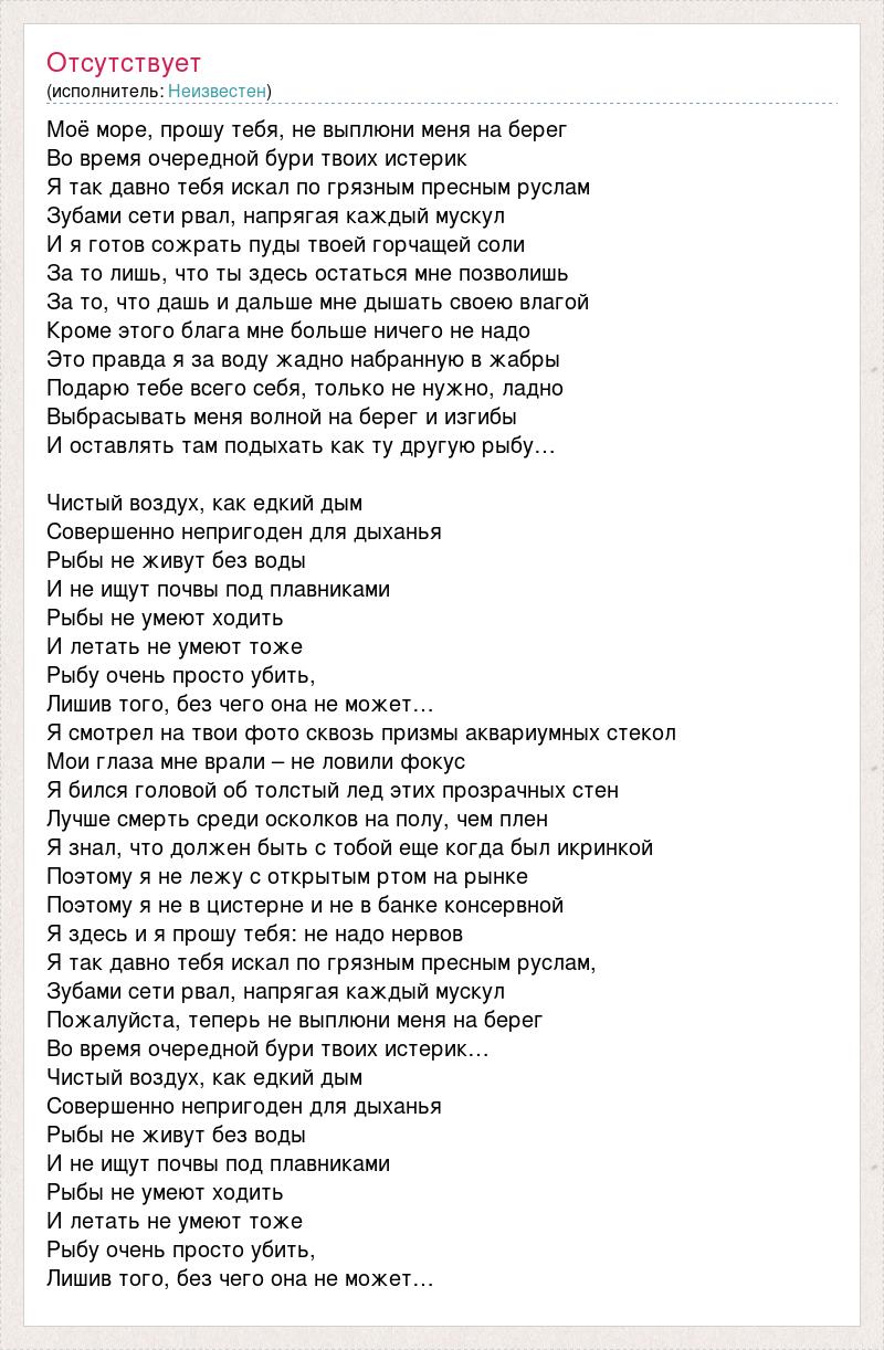 Моё море, прошу тебя, не выплюни меня на берег Во время очередной бури твоих истерик Я так давно тебя искал по грязным пресным руслам Зубами сети рвал, напрягая каждый мускул И я готов сожрать пуды твоей горчащей соли За то лишь, что ты здесь остаться мне позволишь За то, что дашь и дальше мне дышать своею влагой Кроме этого блага мне больше ничего не надо Это правда я за воду жадно набранную в жабры Подарю тебе всего себя, только не нужно, ладно Выбрасывать меня волной на берег и изгибы И оставлять там подыхать как ту другую рыбу… Чистый воздух, как едкий дым Совершенно непригоден для дыханья Рыбы не живут без воды И не ищут почвы под плавниками Рыбы не умеют ходить И летать не умеют тоже Рыбу очень просто убить, Лишив того, без чего она не может… Я смотрел на твои фото сквозь призмы аквариумных стекол Мои глаза мне врали – не ловили фокус Я бился головой об толстый лед этих прозрачных стен Лучше смерть среди осколков на полу, чем плен Я знал, что должен быть с тобой еще когда был икринкой Поэтому я не лежу с открытым ртом на рынке Поэтому я не в цистерне и не в банке консервной Я здесь и я прошу тебя: не надо нервов Я так давно тебя искал по грязным пресным руслам, Зубами сети рвал, напрягая каждый мускул Пожалуйста, теперь не выплюни меня на берег Во время очередной бури твоих истерик… Чистый воздух, как едкий дым Совершенно непригоден для дыханья Рыбы не живут без воды И не ищут почвы под плавниками Рыбы не умеют ходить И летать не умеют тоже Рыбу очень просто убить, Лишив того, без чего она не может…
