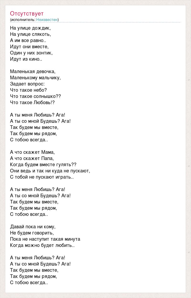 На улице дождик, На улице слякоть, А им все равно.. Идут они вместе, Один у них зонтик, Идут из кино.. Маленькая девочка, Маленькому мальчику, Задает вопрос: Что такое небо? Что такое солнышко?? Что такое Любовь!? А ты меня Любишь? Ага! А ты со мной Будешь? Ага! Так будем мы вместе, Так будем мы рядом, С тобою всегда.. А что скажет Мама, А что скажет Папа, Когда будем вместе гулять?? Они ведь и так ни куда не пускают, С тобой не пускают играть.. А ты меня Любишь? Ага! А ты со мной Будешь? Ага! Так будем мы вместе, Так будем мы рядом, С тобою всегда.. Давай пока ни кому, Не будем говорить, Пока не наступит такая минута Когда можно будет любить.. А ты меня Любишь? Ага! А ты со мной Будешь? Ага! Так будем мы вместе, Так будем мы рядом, С тобою всегда..