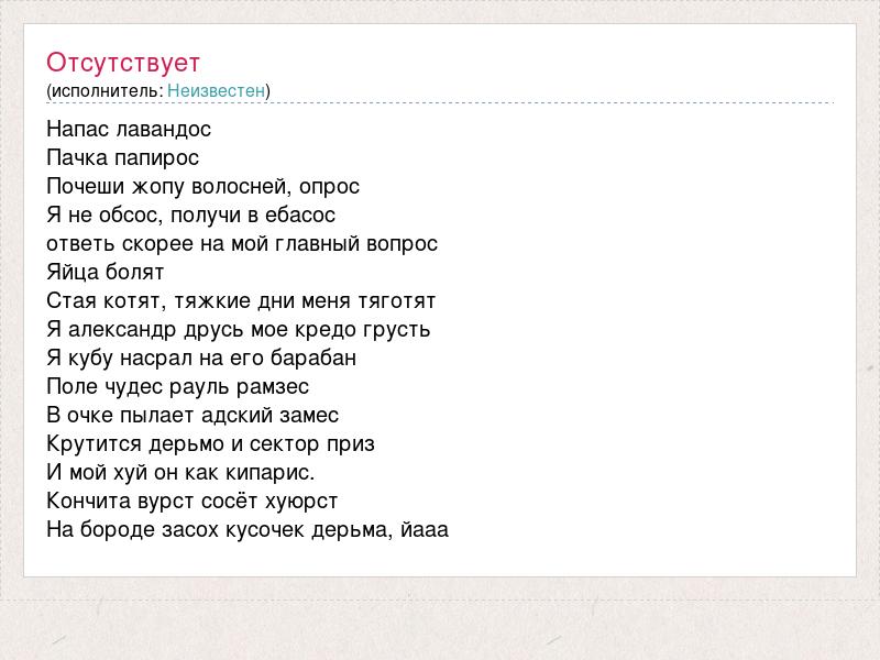 Напас лавандос Пачка папирос Почеши жопу волосней, опрос Я не обсос, получи в ебасос ответь скорее на мой главный вопрос Яйца болят Стая котят, тяжкие дни меня тяготят Я александр друсь мое кредо грусть Я кубу насрал на его барабан Поле чудес рауль рамзес В очке пылает адский замес Крутится дерьмо и сектор приз И мой хуй он как кипарис. Кончита вурст сосёт хуюрст На бороде засох кусочек дерьма, йааа