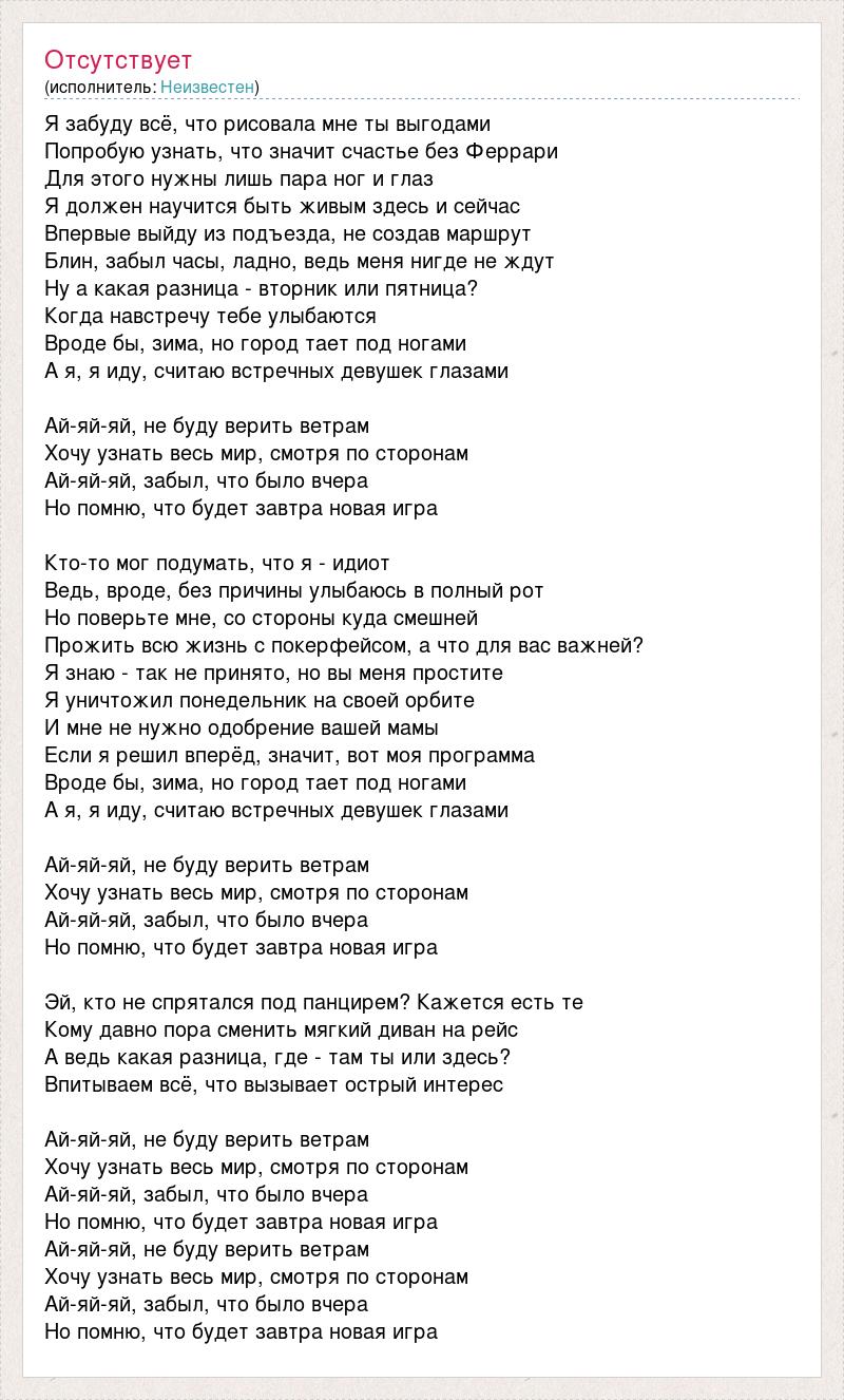 Я забуду всё, что рисовала мне ты выгодами Попробую узнать, что значит счастье без Феррари Для этого нужны лишь пара ног и глаз Я должен научится быть живым здесь и сейчас Впервые выйду из подъезда, не создав маршрут Блин, забыл часы, ладно, ведь меня нигде не ждут Ну а какая разница - вторник или пятница? Когда навстречу тебе улыбаются Вроде бы, зима, но город тает под ногами А я, я иду, считаю встречных девушек глазами Ай-яй-яй, не буду верить ветрам Хочу узнать весь мир, смотря по сторонам Ай-яй-яй, забыл, что было вчера Но помню, что будет завтра новая игра Кто-то мог подумать, что я - идиот Ведь, вроде, без причины улыбаюсь в полный рот Но поверьте мне, со стороны куда смешней Прожить всю жизнь с покерфейсом, а что для вас важней? Я знаю - так не принято, но вы меня простите Я уничтожил понедельник на своей орбите И мне не нужно одобрение вашей мамы Если я решил вперёд, значит, вот моя программа Вроде бы, зима, но город тает под ногами А я, я иду, считаю встречных девушек глазами Ай-яй-яй, не буду верить ветрам Хочу узнать весь мир, смотря по сторонам Ай-яй-яй, забыл, что было вчера Но помню, что будет завтра новая игра Эй, кто не спрятался под панцирем? Кажется есть те Кому давно пора сменить мягкий диван на рейс А ведь какая разница, где - там ты или здесь? Впитываем всё, что вызывает острый интерес Ай-яй-яй, не буду верить ветрам Хочу узнать весь мир, смотря по сторонам Ай-яй-яй, забыл, что было вчера Но помню, что будет завтра новая игра Ай-яй-яй, не буду верить ветрам Хочу узнать весь мир, смотря по сторонам Ай-яй-яй, забыл, что было вчера Но помню, что будет завтра новая игра