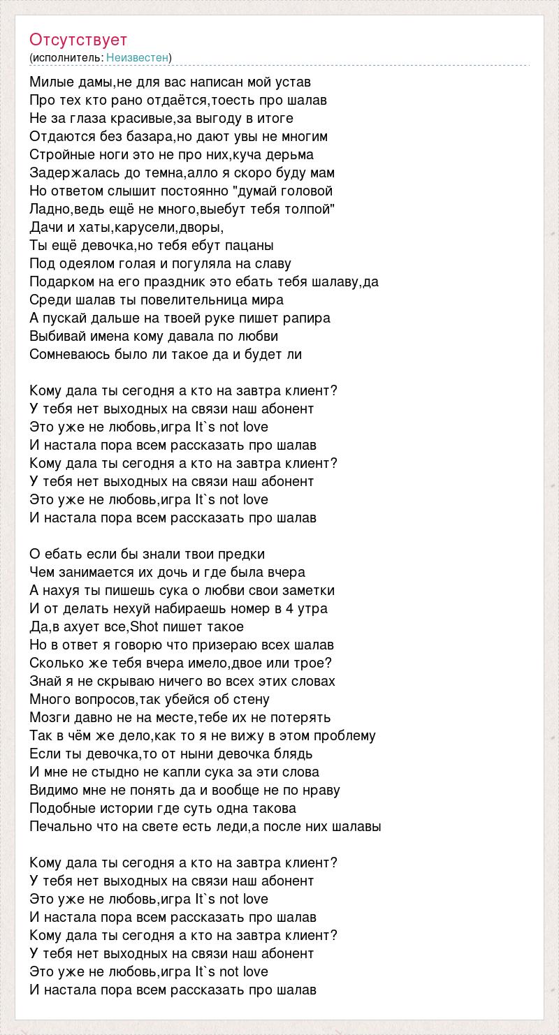 Милые дамы,не для вас написан мой устав Про тех кто рано отдаётся,тоесть про шалав Не за глаза красивые,за выгоду в итоге Отдаются без базара,но дают увы не многим Стройные ноги это не про них,куча дерьма Задержалась до темна,алло я скоро буду мам Но ответом слышит постоянно "думай головой Ладно,ведь ещё не много,выебут тебя толпой" Дачи и хаты,карусели,дворы, Ты ещё девочка,но тебя ебут пацаны Под одеялом голая и погуляла на славу Подарком на его праздник это ебать тебя шалаву,да Среди шалав ты повелительница мира А пускай дальше на твоей руке пишет рапира Выбивай имена кому давала по любви Сомневаюсь было ли такое да и будет ли Кому дала ты сегодня а кто на завтра клиент? У тебя нет выходных на связи наш абонент Это уже не любовь,игра It`s not love И настала пора всем рассказать про шалав Кому дала ты сегодня а кто на завтра клиент? У тебя нет выходных на связи наш абонент Это уже не любовь,игра It`s not love И настала пора всем рассказать про шалав О ебать если бы знали твои предки Чем занимается их дочь и где была вчера А нахуя ты пишешь сука о любви свои заметки И от делать нехуй набираешь номер в 4 утра Да,в ахует все,Shot пишет такое Но в ответ я говорю что призераю всех шалав Сколько же тебя вчера имело,двое или трое? Знай я не скрываю ничего во всех этих словах Много вопросов,так убейся об стену Мозги давно не на месте,тебе их не потерять Так в чём же дело,как то я не вижу в этом проблему Если ты девочка,то от ныни девочка блядь И мне не стыдно не капли сука за эти слова Видимо мне не понять да и вообще не по нраву Подобные истории где суть одна такова Печально что на свете есть леди,а после них шалавы Кому дала ты сегодня а кто на завтра клиент? У тебя нет выходных на связи наш абонент Это уже не любовь,игра It`s not love И настала пора всем рассказать про шалав Кому дала ты сегодня а кто на завтра клиент? У тебя нет выходных на связи наш абонент Это уже не любовь,игра It`s not love И настала пора всем рассказать про шалав