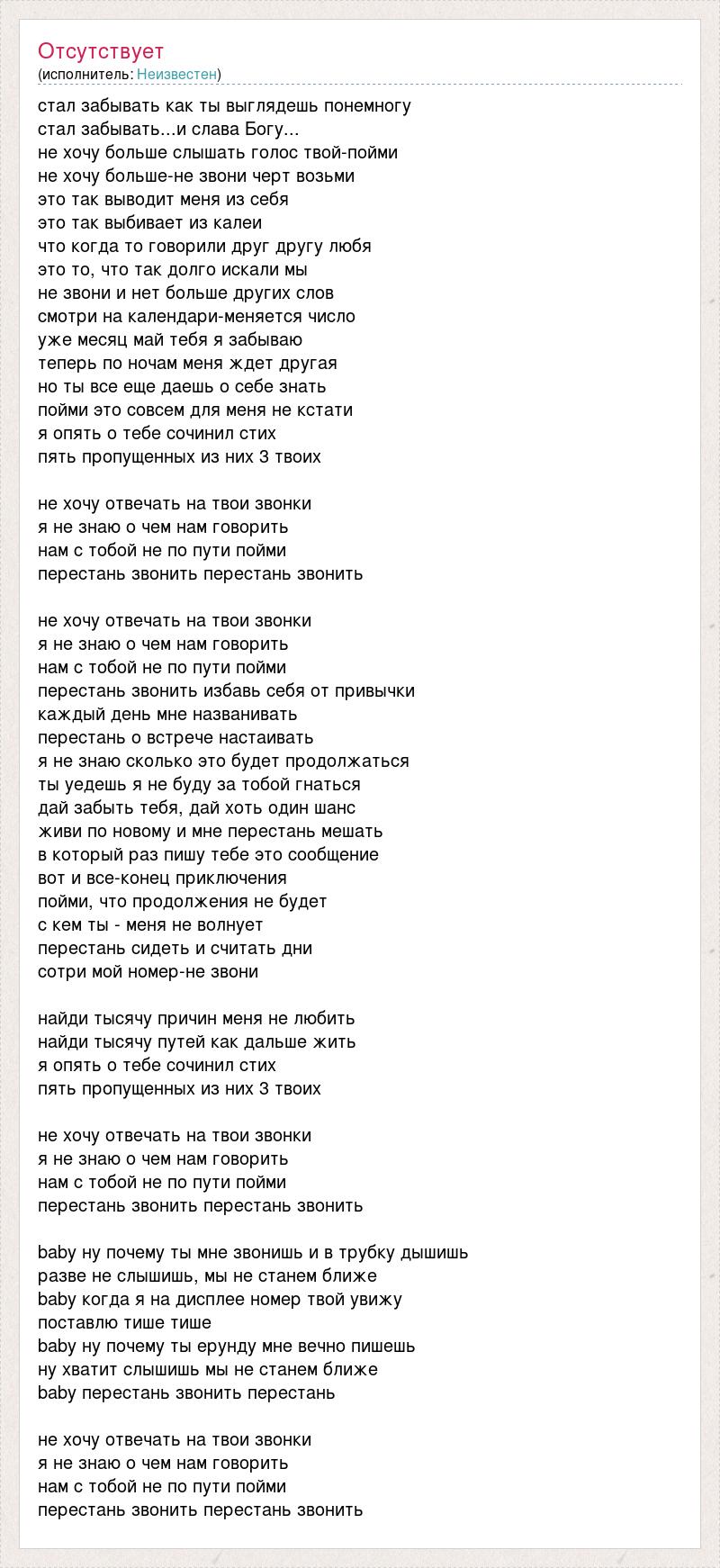 стал забывать как ты выглядешь понемногу стал забывать...и слава Богу... не хочу больше слышать голос твой-пойми не хочу больше-не звони черт возьми это так выводит меня из себя это так выбивает из калеи что когда то говорили друг другу любя это то, что так долго искали мы не звони и нет больше других слов смотри на календари-меняется число уже месяц май тебя я забываю теперь по ночам меня ждет другая но ты все еще даешь о себе знать пойми это совсем для меня не кстати я опять о тебе сочинил стих пять пропущенных из них 3 твоих не хочу отвечать на твои звонки я не знаю о чем нам говорить нам с тобой не по пути пойми перестань звонить перестань звонить не хочу отвечать на твои звонки я не знаю о чем нам говорить нам с тобой не по пути пойми перестань звонить избавь себя от привычки каждый день мне названивать перестань о встрече настаивать я не знаю сколько это будет продолжаться ты уедешь я не буду за тобой гнаться дай забыть тебя, дай хоть один шанс живи по новому и мне перестань мешать в который раз пишу тебе это сообщение вот и все-конец приключения пойми, что продолжения не будет с кем ты - меня не волнует перестань сидеть и считать дни сотри мой номер-не звони найди тысячу причин меня не любить найди тысячу путей как дальше жить я опять о тебе сочинил стих пять пропущенных из них 3 твоих не хочу отвечать на твои звонки я не знаю о чем нам говорить нам с тобой не по пути пойми перестань звонить перестань звонить baby ну почему ты мне звонишь и в трубку дышишь разве не слышишь, мы не станем ближе baby когда я на дисплее номер твой увижу поставлю тише тише baby ну почему ты ерунду мне вечно пишешь ну хватит слышишь мы не станем ближе baby перестань звонить перестань не хочу отвечать на твои звонки я не знаю о чем нам говорить нам с тобой не по пути пойми перестань звонить перестань звонить