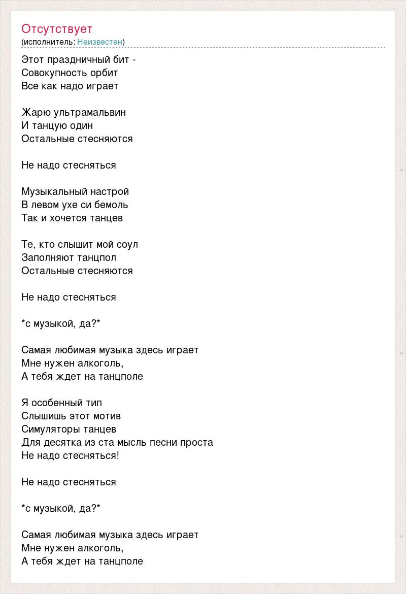 Этот праздничный бит - Совокупность орбит Все как надо играет Жарю ультрамальвин И танцую один Остальные стесняются Не надо стесняться Музыкальный настрой В левом ухе си бемоль Так и хочется танцев Те, кто слышит мой соул Заполняют танцпол Остальные стесняются Не надо стесняться *с музыкой, да?* Самая любимая музыка здесь играет Мне нужен алкоголь, А тебя ждет на танцполе Я особенный тип Слышишь этот мотив Симуляторы танцев Для десятка из ста мысль песни проста Не надо стесняться! Не надо стесняться *с музыкой, да?* Самая любимая музыка здесь играет Мне нужен алкоголь, А тебя ждет на танцполе