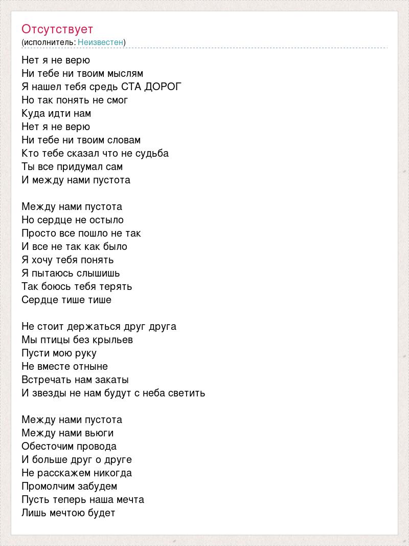 Нет я не верю Ни тебе ни твоим мыслям Я нашел тебя средь СТА ДОРОГ Но так понять не смог Куда идти нам Нет я не верю Ни тебе ни твоим словам Кто тебе сказал что не судьба Ты все придумал сам И между нами пустота Между нами пустота Но сердце не остыло Просто все пошло не так И все не так как было Я хочу тебя понять Я пытаюсь слышишь Так боюсь тебя терять Сердце тише тише Не стоит держаться друг друга Мы птицы без крыльев Пусти мою руку Не вместе отныне Встречать нам закаты И звезды не нам будут с неба светить Между нами пустота Между нами вьюги Обесточим провода И больше друг о друге Не расскажем никогда Промолчим забудем Пусть теперь наша мечта Лишь мечтою будет