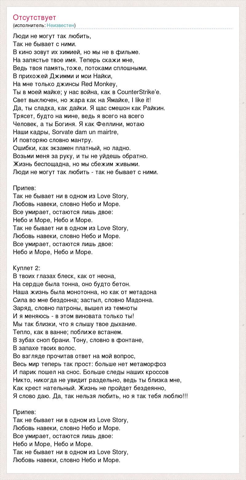 Люди не могут так любить, Так не бывает с ними. В кино зовут их химией, но мы не в фильме. На запястье твое имя. Теперь скажи мне, Ведь твоя память,тоже, потоками сплошными. В прихожей Джимми и мои Найки, На мне только джинсы Red Monkey, Ты в моей майке; у нас война, как в CounterStrike’е. Свет выключен, но жара как на Ямайке, I like it! Да, ты сладка, как дайки. Я щас смешон как Райкин. Трясет, будто на мине, ведь я всего на всего Человек, а ты Богиня. Я как Феллини, мотаю Наши кадры, Sorvate dam un mairtre, И повторяю словно мантру. Ошибки, как экзамен платный, но ладно. Возьми меня за руку, и ты не уйдешь обратно. Жизнь беспощадна, но мы сбежим живыми. Люди не могут так любить - так не бывает с ними. Припев: Так не бывает ни в одном из Love Story, Любовь навеки, словно Небо и Море. Все умирает, остаются лишь двое: Небо и Море, Небо и Море. Так не бывает ни в одном из Love Story, Любовь навеки, словно Небо и Море. Все умирает, остаются лишь двое: Небо и Море, Небо и Море. Куплет 2: В твоих глазах блеск, как от неона, На сердце была тонна, оно будто бетон. Наша жизнь была монотонна, но как от метадона Сила во мне бездонна; застыл, словно Мадонна. Заряд, словно патроны, вышел из темноты И я меняюсь - в этом виновата только ты! Мы так близки, что я слышу твое дыхание. Тепло, как в ванне; поближе встанем. В зубах сноп брани. Тону, словно в фонтане, В запахе твоих волос. Во взгляде прочитав ответ на мой вопрос, Весь мир теперь так прост: больше нет метаморфоз И парик пошел на снос. Больше следы наших кроссов Никто, никогда не увидит раздельно, ведь ты близка мне, Как крест нательный. Жизнь не пройдет бездеянно, Я слово даю. Да, так нельзя любить, но я так тебя люблю!!! Припев: Так не бывает ни в одном из Love Story, Любовь навеки, словно Небо и Море. Все умирает, остаются лишь двое: Небо и Море, Небо и Море. Так не бывает ни в одном из Love Story, Любовь навеки, словно Небо и Море.