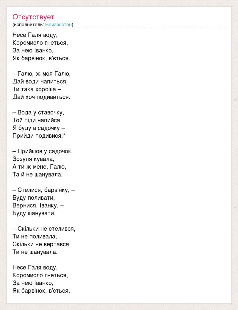 Несе Галя воду, Коромисло гнеться, За нею Іванко, Як барвінок, в’ється. – Галю, ж моя Галю, Дай води напиться, Ти така хороша – Дай хоч подивиться. – Вода у ставочку, Той піди напийся, Я буду в садочку – Прийди подивися.* – Прийшов у садочок, Зозуля кувала, А ти ж мене, Галю, Та й не шанувала. – Стелися, барвінку, – Буду поливати, Вернися, Іванку, – Буду шанувати. – Скільки не стелився, Ти не поливала, Скільки не вертався, Ти не шанувала. Несе Галя воду, Коромисло гнеться, За нею Іванко, Як барвінок, в’ється.